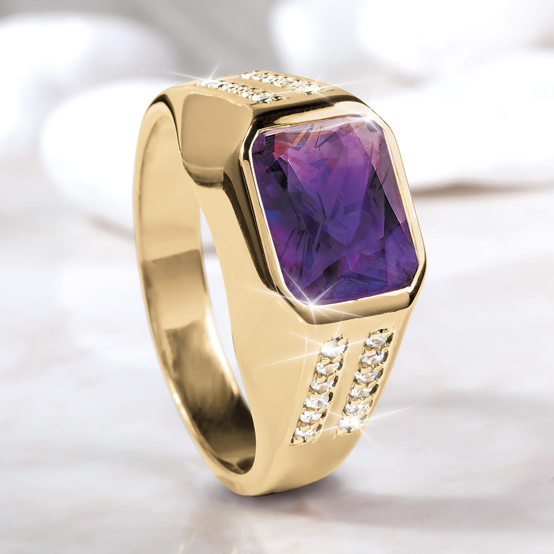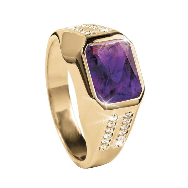 This ring has a striking centre of 3.49ct purple Diamondeau® - flawless simulated diamond. The glistening stone captures the light to create a dazzling effect with plenty of sparkle. On the shoulders is a cascade of a total of 24 accent Diamondeau® - flawless simulated diamond. Available in sterling silver plated in 18k yellow gold for timeless appeal. Making it a great gift idea for any style conscious man.