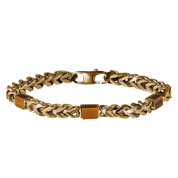This classic piece is crafted in durable stainless steel with a warm yellow gold finish and showcases three Tiger’s Eye stations that add a touch of earthy elegance and character. A bracelet that symbolizes courage, focus, and confidence.