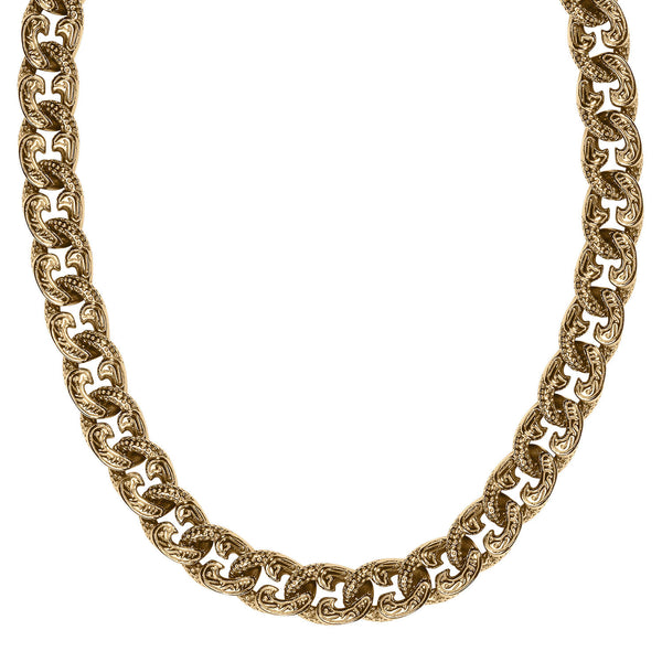 This eye catching necklace is a must have! Finely crafted from stainless steel luxuriously finished in yellow gold. The shaped curb links are inspired by the large waves out at sea, each individually engraved with an intricate pattern. This outstanding necklace will provide an elegant display. A must to add to your jewelry collection.