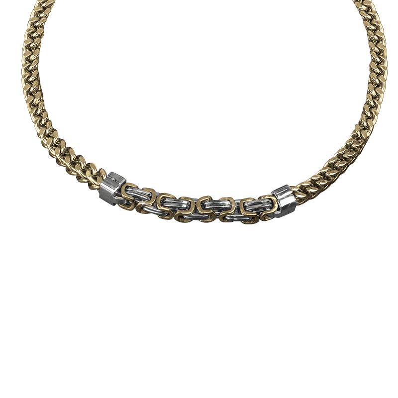 Our latest steel collection of jewelry for men combines our classic foxtail solid chain with a distinctive byzantine section in the middle. Each piece is expertly formed from premium grade stainless steel before being finished with luxurious 18k yellow gold on the chain and a unique two-tone effect on the central feature.