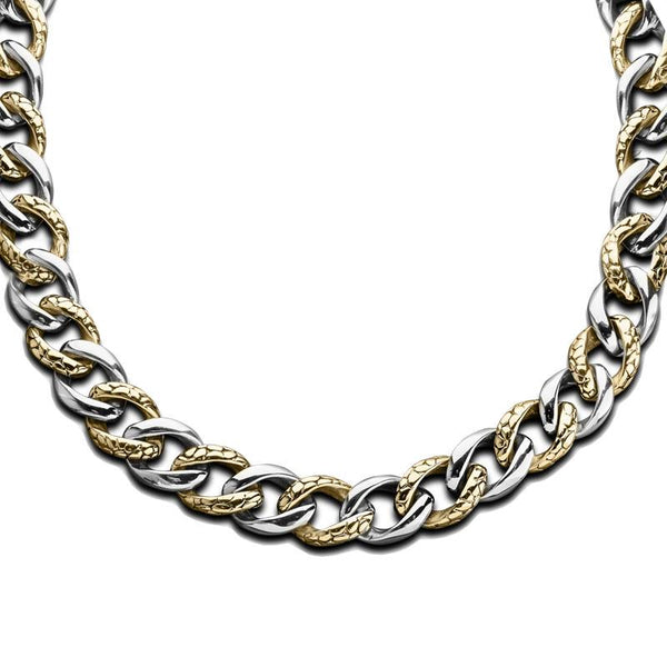 A classic curb necklace should be a part of every man's accessory collection. Each link is expertly cast from premium grade stainless steel and we have added an embossed pattern to alternate links for a designer twist. Each piece is polished to perfection before being 2 toned with luxurious yellow gold.
