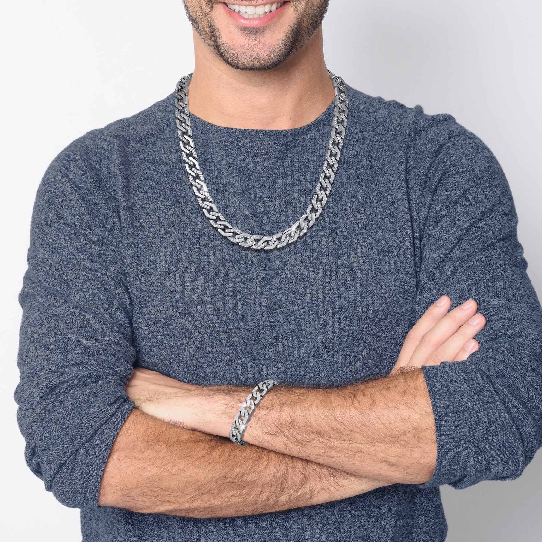 A necklace that redefines luxury with its exquisite design. This meticulously crafted necklace is made from premium grade stainless steel that imparts a sleek, modern aesthetic that complements any ensemble. What sets these pieces apart are the alternating links adorned with ice white Diamondeau®, flawless simulated diamond, adding a touch of opulence and brilliance to the ensemble. Whether you’re dressing up for a special occasion or simply looking to make a statement in your everyday style, this steel men's necklace is the perfect choice.