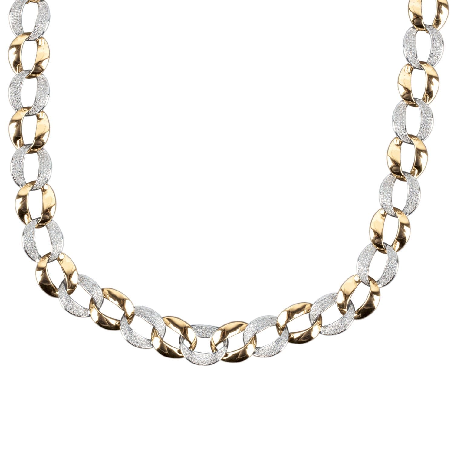 You’ll notice the brilliant shimmer on this attractive curb necklace. Polished links are plated in 18k yellow gold alternated with links set with glistening Diamondeau® - flawless simulated diamond. A perfect style for everyday wear.