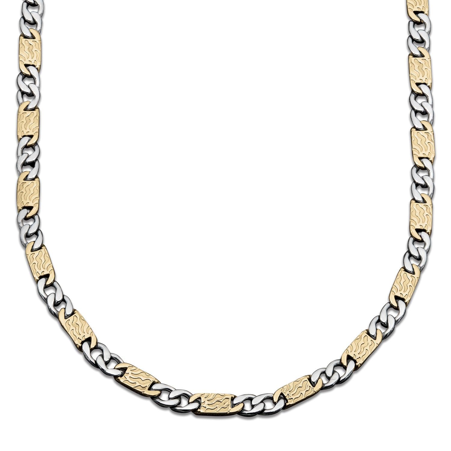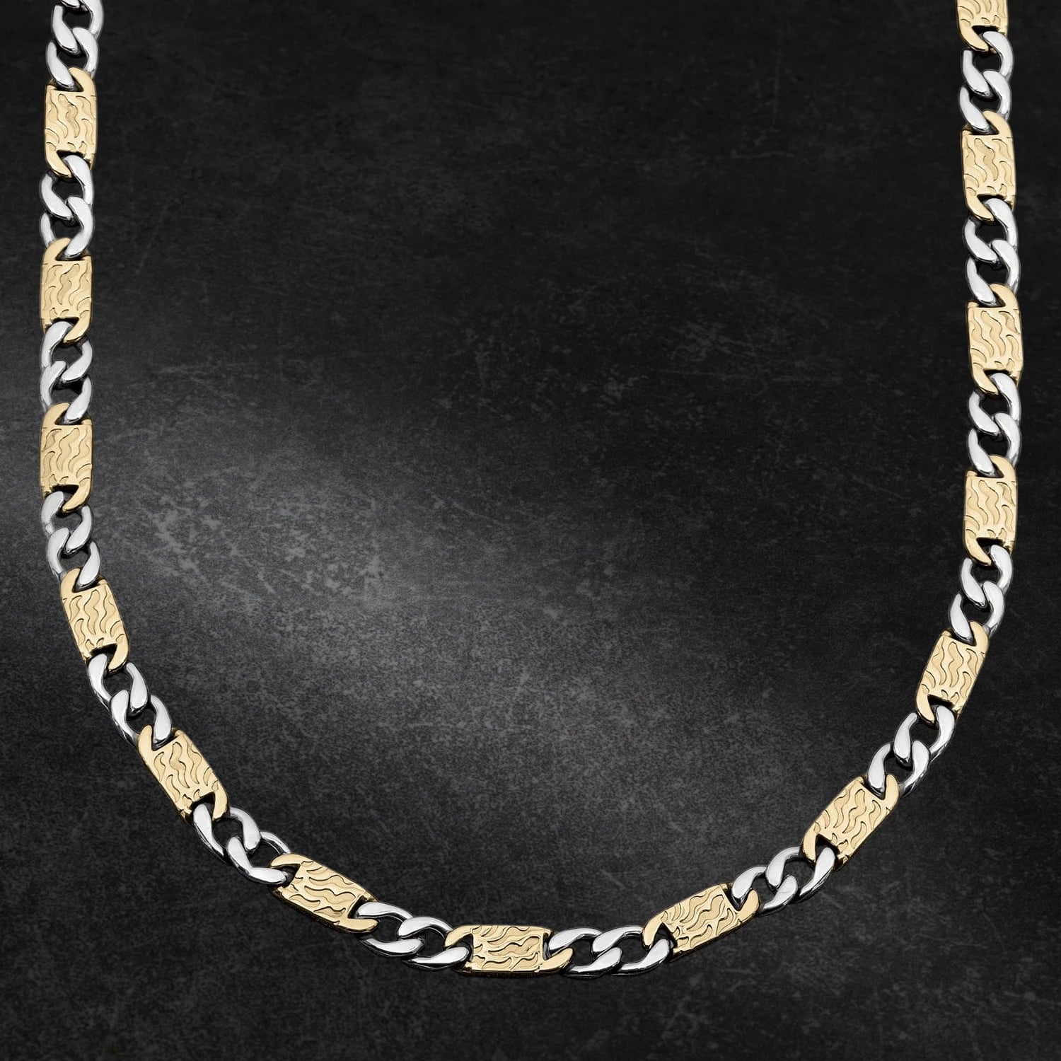 The moment you receive this piece you will not be disappointed. You will appreciate the quality, the weight and feel of each piece. We have used premium stainless steel and enhanced the solid, patterned links with 18k yellow gold for a two-tone effect. A real show stopping necklace.