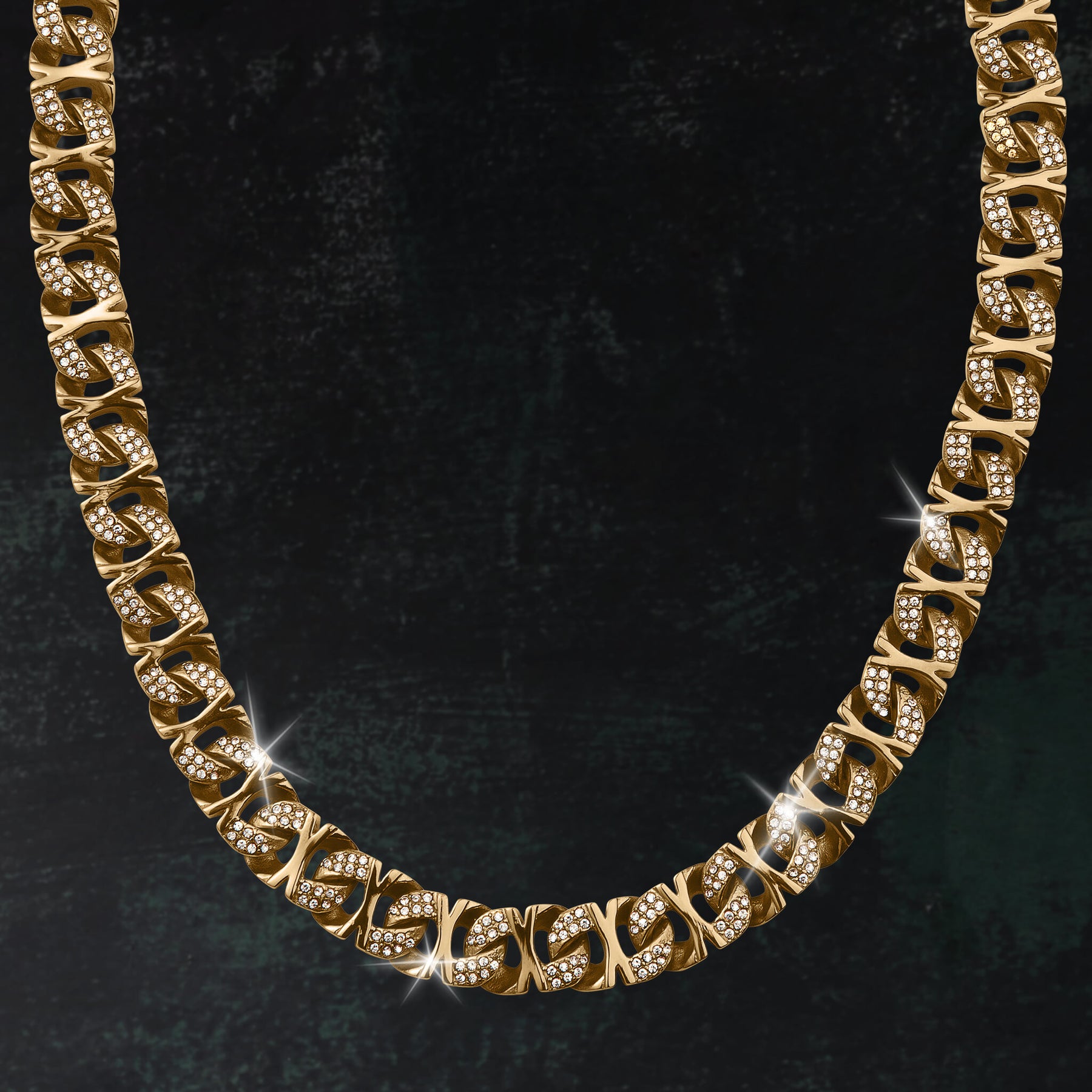 Introducing the ultimate necklace to elevate your style, giving the classic curb design a fancy twist – with this men's stainless steel, finished in gold necklace. Crafted with precision and attention to detail, this stunning piece features shimmering clear gems that are throughout the design, including the clasp, that add a touch of sophistication and refinement to any outfit. Whether you're dressing up for a special occasion or adding some extra flair to your everyday look, this set is sure to make a welcome impact.