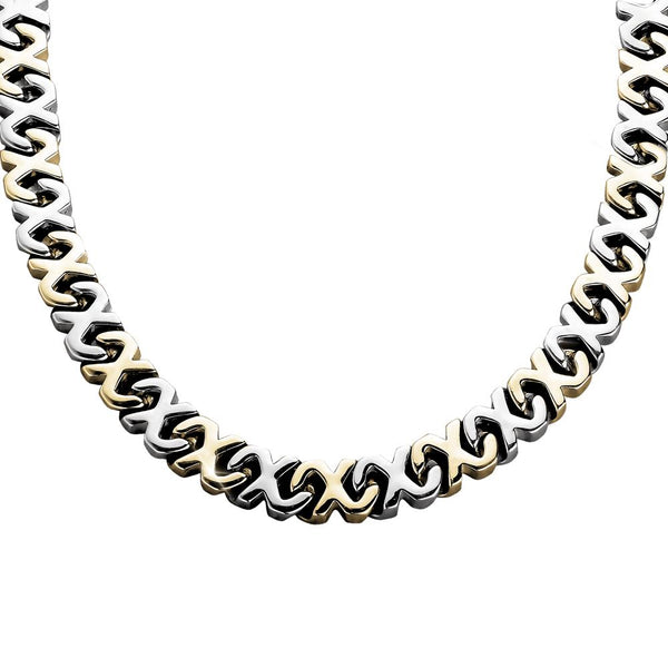 This stylish men's collection is ingeniously made up of interlocked X shaped links that will curve in a streamlined fashion around your wrist and neck. The premium grade solid Stainless Steel links have been given a fashionable 2 tone treatment, alternating original Steel and 18K Yellow Gold fused links. Necklace measures 22 Inch, bracelet fits up to an 8.5 Inch wrist. Magnificent presentation case dispatches with each piece.