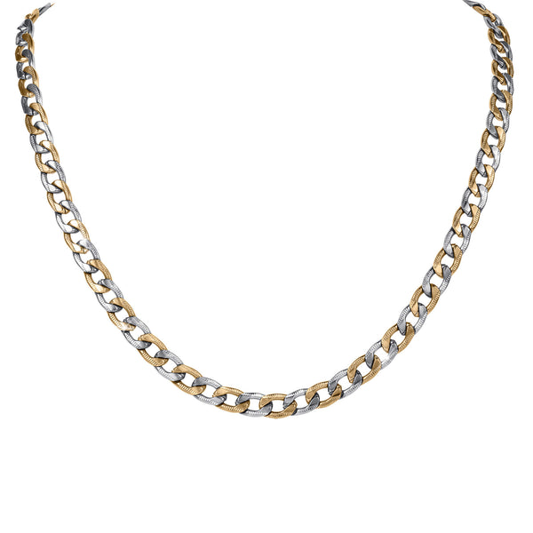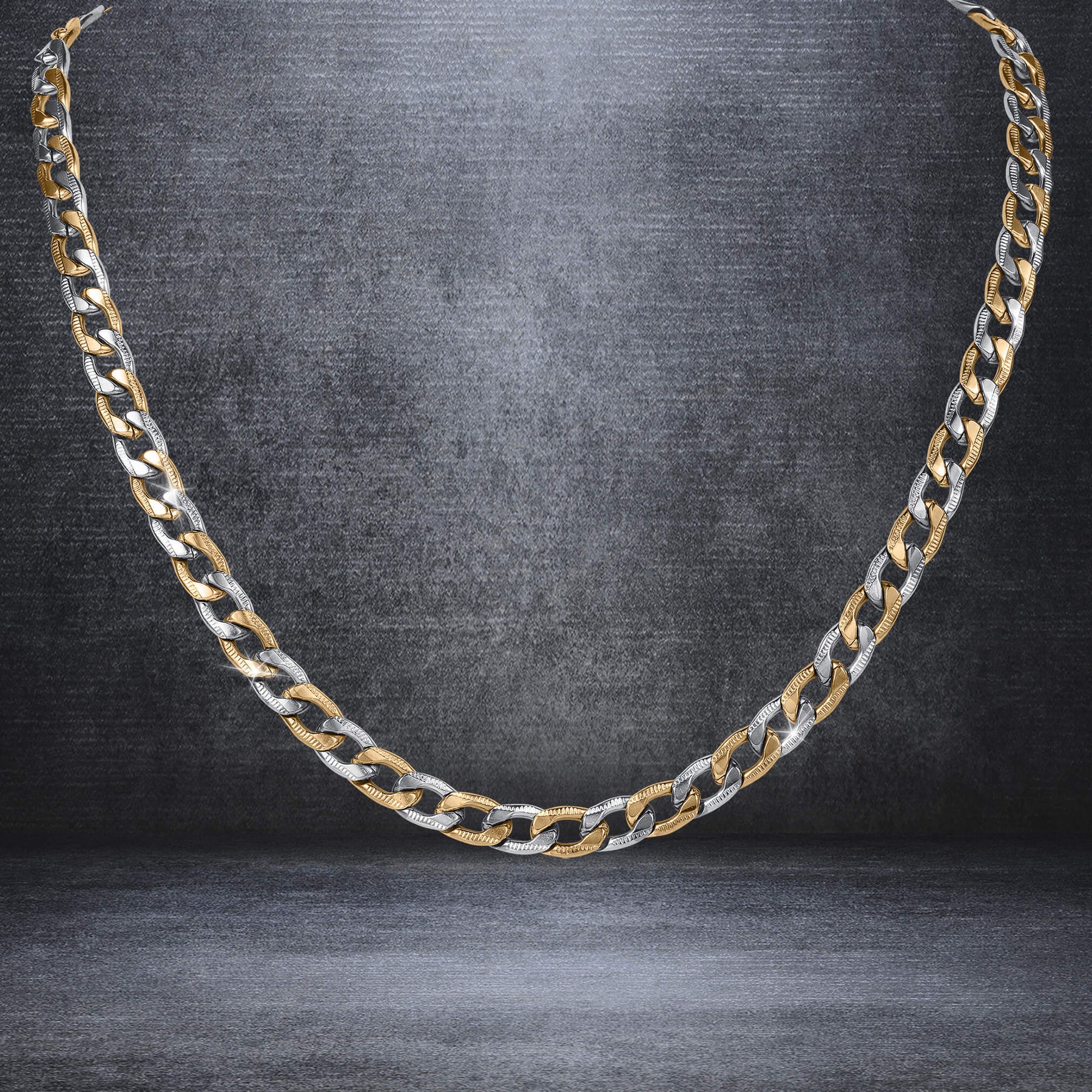 Designed to make an impression. A two tone classic curb chain is expertly crafted from durable stainless steel. The outer edges of each link feature bevelled detailing, adding depth and dimension to the already striking design. The contrast between the steel and gold finishes creates a dynamic, sophisticated look that’s perfect for upgrading your everyday style.