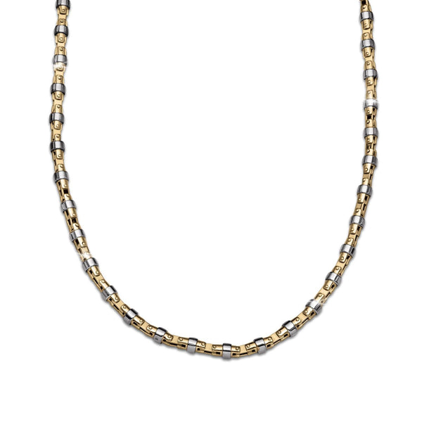 Give him a masculine and striking look. From the moment you receive this collection you won’t be disappointed. You’ll feel the weight and appreciate the quality. Fashioned from premium stainless steel with a two-tone finish. There are cuffs of steel around the 18k gold plated barrel sections which appear riveted in place. Available in necklace or matching bracelet – or buy together for additional savings.