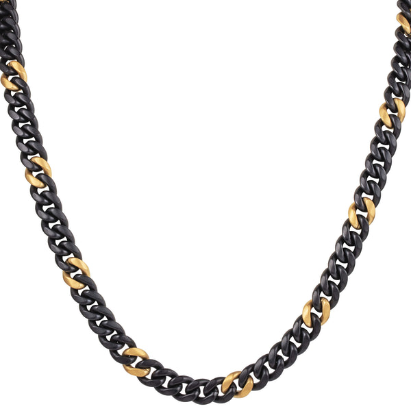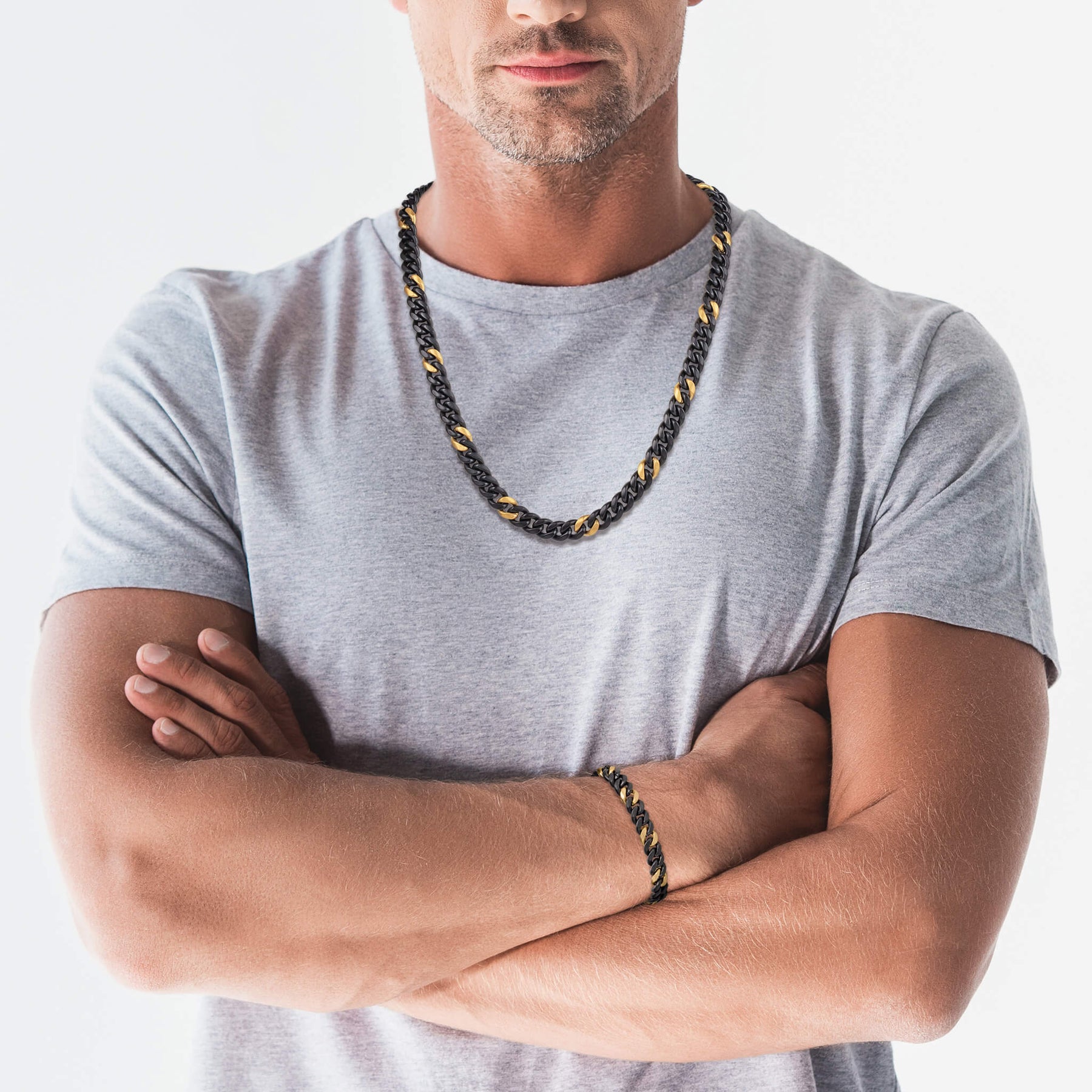 Elevate your style with this classic Cuban chain, meticulously crafted from premium grade stainless steel. This men's necklace combines durability with timeless elegance. The two tone matt black and gold finish offers a bold yet sophisticated look, perfect for both casual and formal occasions. Whether you’re making a statement or adding a finishing touch to your outfit, this delivers unmatched style and versatility.