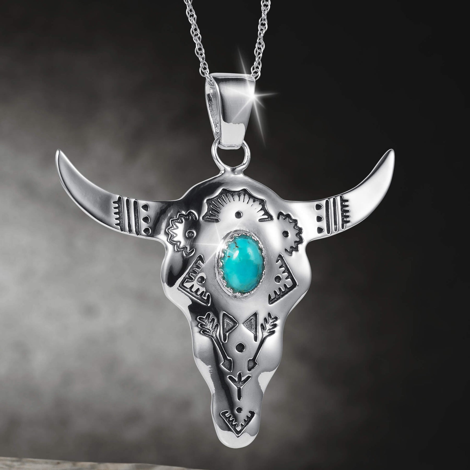 Unleash a bold spirit with our “Bull’s strength Pendant”. This striking men’s piece features a meticulously crafted bull’s head in sterling silver, showcasing every rugged detail and strength of this powerful symbol. The oxidized finish enhances the depth of the overall design. At the center, an oval Arizona Turquoise commands attention, adding a burst of vibrant color to this fierce yet sophisticated pendant.