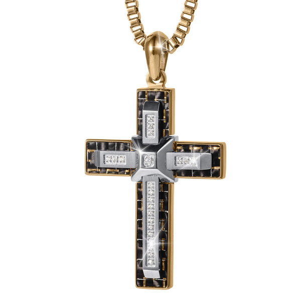 A bold statement of faith and style. A stainless steel cross pendant, featuring a striking two tone design, this pendant showcases a double layered cross, expertly inlaid with sleek carbon fibre for a modern edge. At the center a polished steel cross, set with sparkling Diamondeau®, flawless simulated diamond, adds a touch of sophistication. This piece offers a refined look that captures strength, faith and elegance all in one.