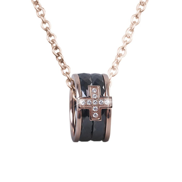 The perfect set to compliment many of our designer timepieces. Featuring faceted bands of Hi-tech ceramic enveloped in settings of solid stainless steel fused with rich red gold. A cross set with our flawless Diamondeau® - flawless simulated diamonds is then attached to each piece for a luxurious finishing touch. Pendant includes matching chain.