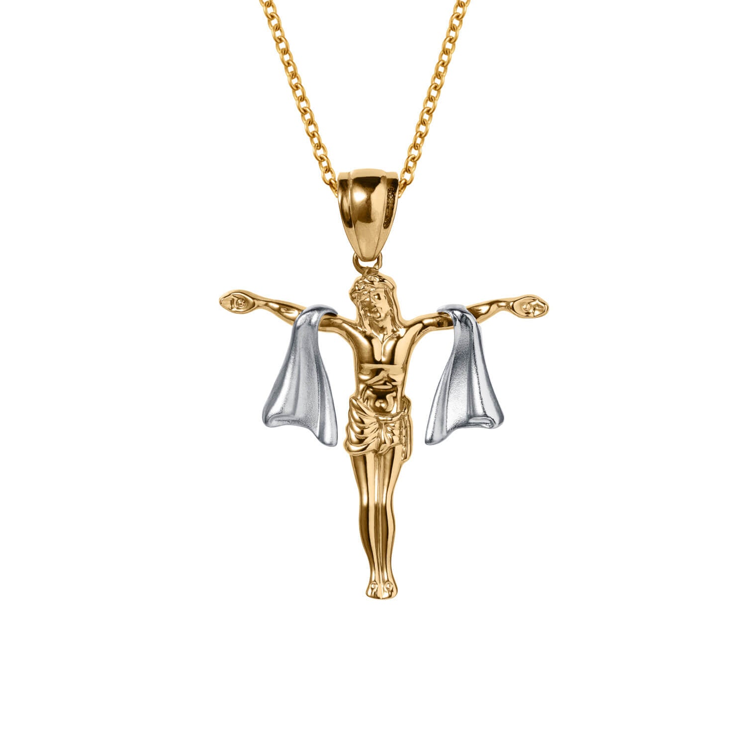 An outstanding statement piece of jewelry made from premium sterling silver in a two-tone effect with 18k yellow gold finish. Crucifix jewelry has great symbolism and makes a popular gift for just about any occasion, including religious occasions such as First Communion, Confirmation or simply a great piece for your collection.