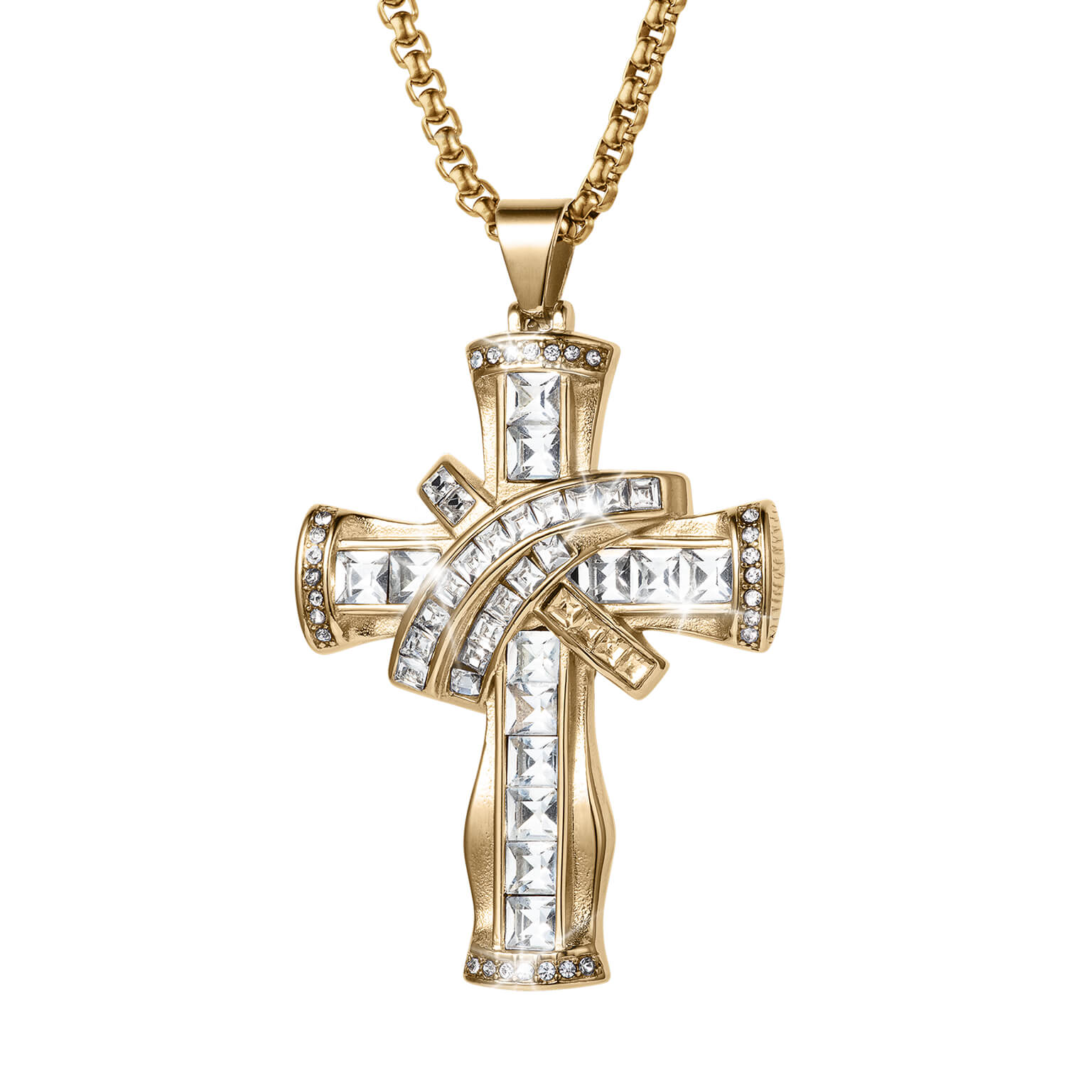This chunky stainless steel cross is the perfect way to represent your faith. Handcrafted from premium grade stainless steel with a yellow gold finish. A double cross layer has been added to the center of the design with square cut white Diamondeau®, flawless simulated diamond. Extra shimmering gems adorn the cross where faith meets sparkle. Show your compassion with this unique cross.
