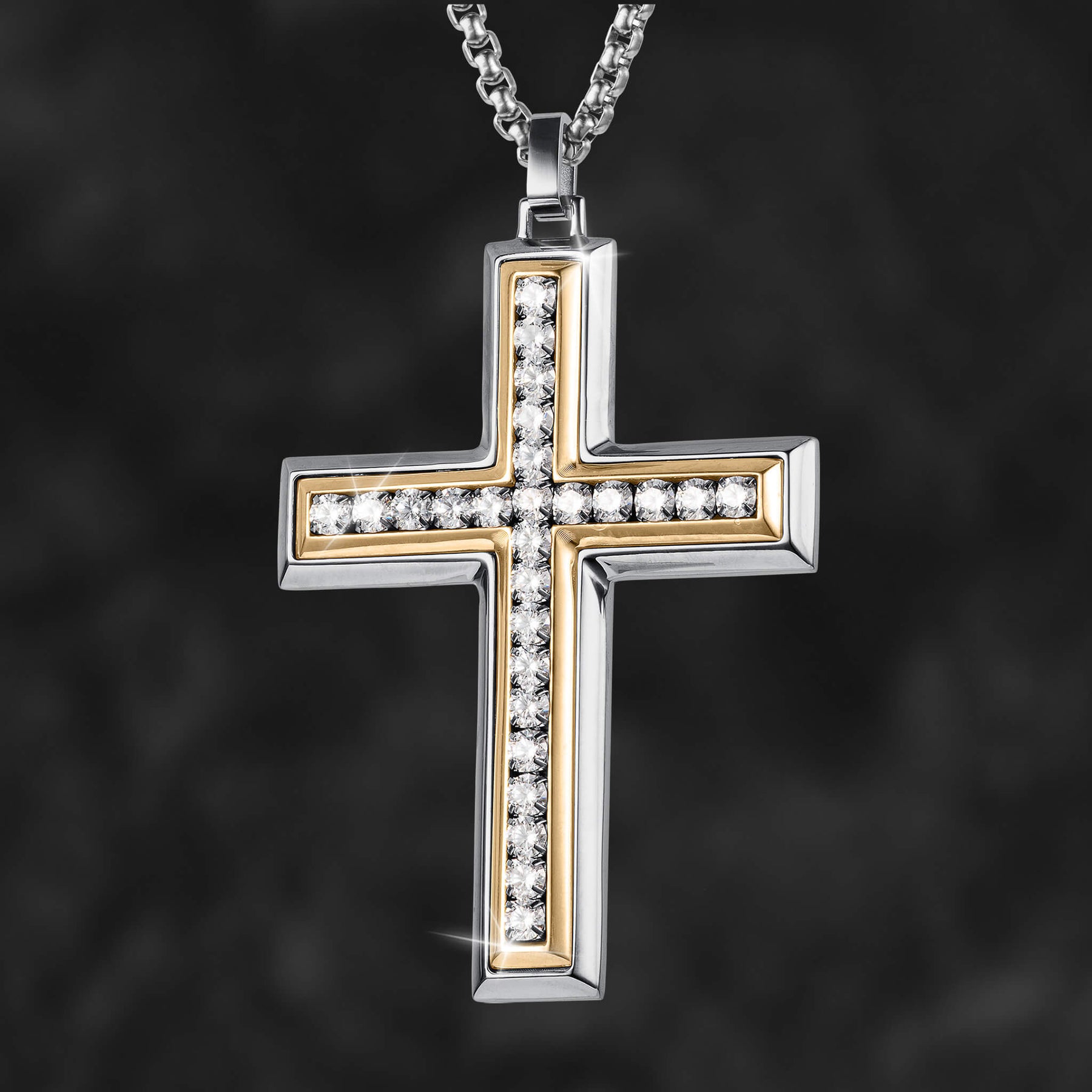 A distinguished crucifix pendant, a symbol of strength and style. Crafted from stainless steel, finished in a two tone design. A standout cross, adorned with round shimmering Diamondeau®, flawless simulated diamond, symbolizes both faith and fashion.