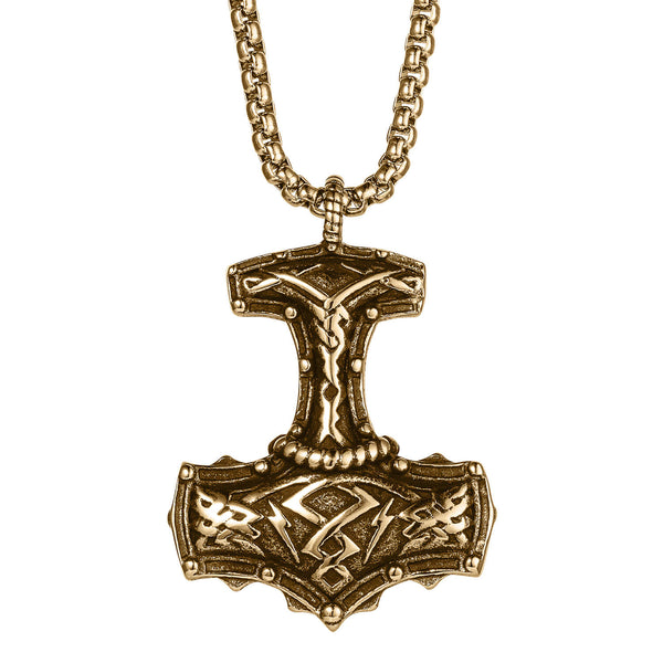 Thor's hammer is a powerful amulet used in Norse mythology. Thor carried his magical hammer Mjölnir around with him and used it to create lightning and thunder. This stylish stainless steel pendant finished in yellow gold features an intricately designed pattern. This pendant is the perfect accessory for men who believe in strength and masculinity.