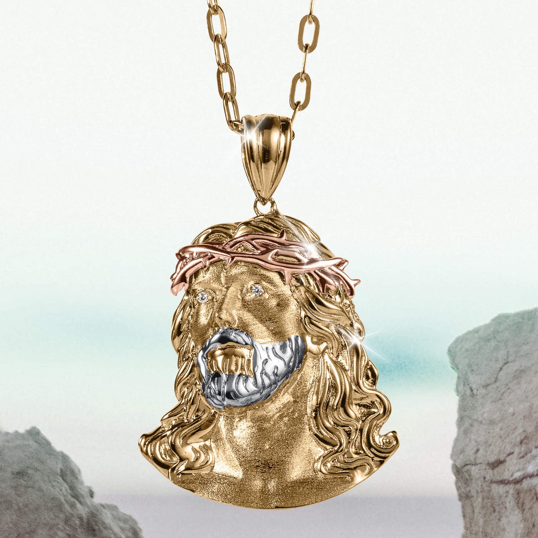 A powerful symbol of faith and resilience, this pendant captures the iconic image of Jesus, adorned with a crown of thorns, a testament to sacrifice and strength. Crafted in sterling silver and finished in warm yellow gold, the pendant features a silver-tone beard and a delicate rose gold crown of thorns, enhanced by two shimmering Diamondeau®, flawless simulated diamond eyes. The three tones of this design are more than a striking visual, they honor the perfect unity of the Holy Trinity. The three shades come together to embody the Father, Son, and Holy Spirit, distinct yet inseparable in their divine purpose. This piece radiates both reverence and boldness, embodying the unwavering power of faith in a striking, modern design. Perfect for those who wear their beliefs with pride, this pendant is a fashionable yet meaningful addition to any collection.