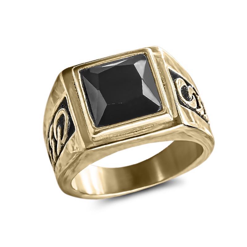 The power of premium stainless steel finished in gold and the debonair sophistication of a single 5.6ct black Diamondeau® - flawless simulated diamond unite in this striking mens ring. The interlinked design on the shoulders and attention to detail and quality, adds a true designer feel to the piece.