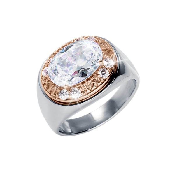 A striking and masculine look, this eye-catching sparkling gem ring is just his handsome style. Expertly crafted from stainless steel with a rose gold halo. This style features an oval-shaped bright white 5.81ct Diamondeau®, flawless simulated diamond center stone, flanked by glittering accents. Buffed to a glorious luster. A look he will turn too often.
