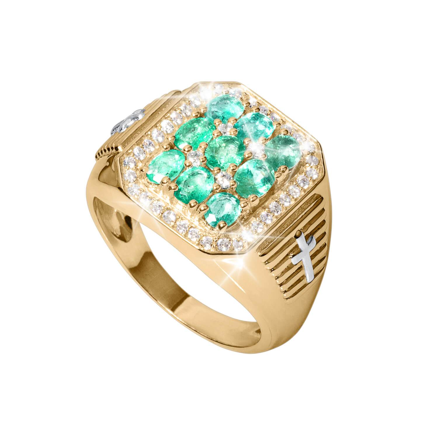 A tailored, timeless ring that will complement his style. Expertly crafted from sterling silver, plated in rich tones of 18k yellow gold, this ring features 9 brilliant round Emeralds. Surrounding the elegant gems are ice white sparkling Diamondeau®, flawless simulated diamond. A dramatic tiered design accentuates the shoulders to complete this bold look. A ring he is sure to treasure.