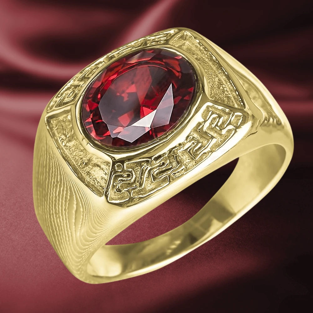 This impressive men's ring is inspired by the red sand beaches of Maui. Crafted from premium grade stainless steel, and plated in fiery 18k yellow gold. Our men's ring holds an impressive 5 carat, oval cut Diamondeau® - flawless simulated diamond in Indian Red. Available in sizes 9-14.
