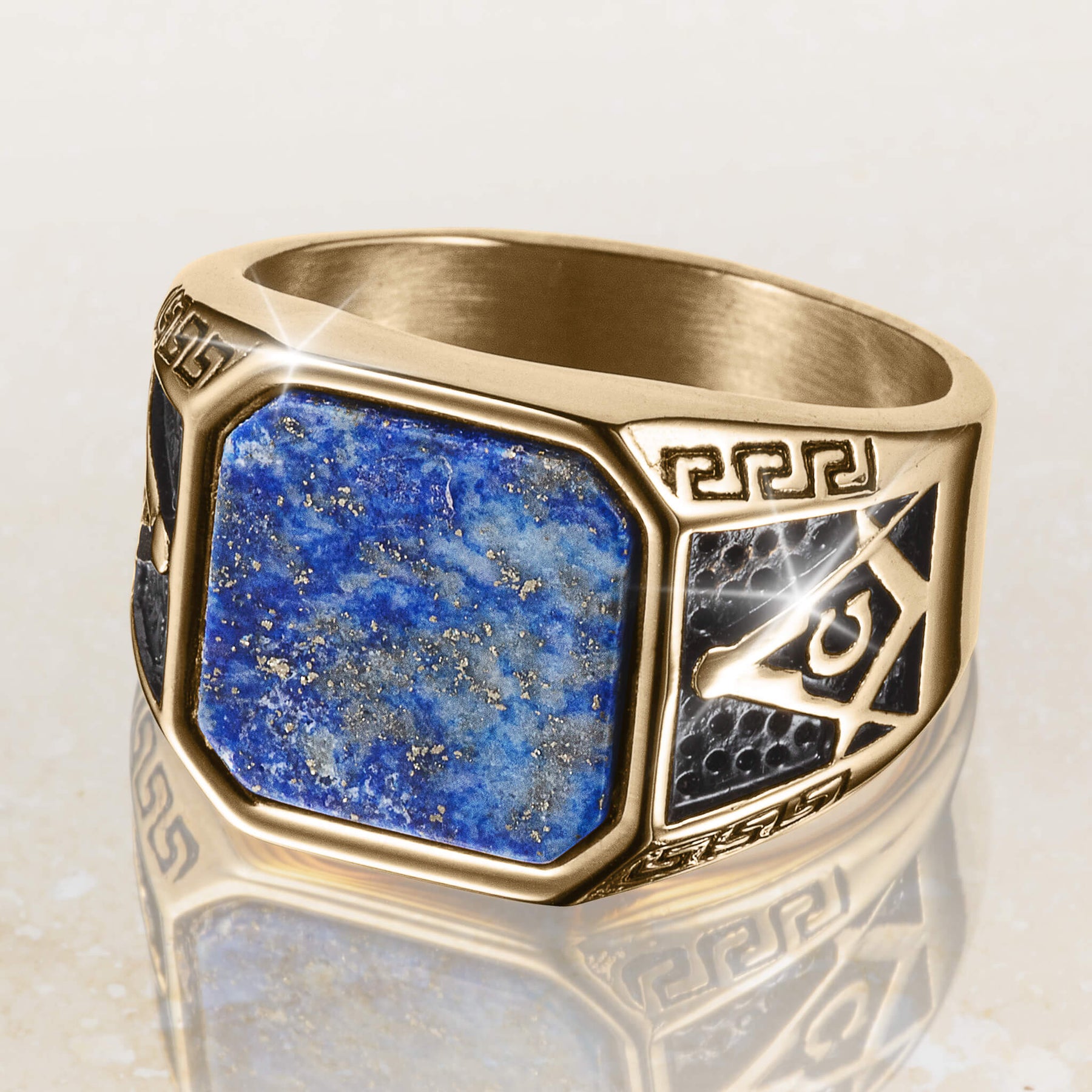 Crafted with precision and utmost attention to detail, this masonic ring is sure to make a lasting impression. The centrepiece is a striking blue Lapis Lazuli stone in a fancy cut, which adds a pop of color. The mount is premium grade stainless steel and features a sleek gold finish. On the shoulders is possibly one of the most identifiable symbols of the Freemason’s the square and compasses. Go ahead add this ring to your collection today.