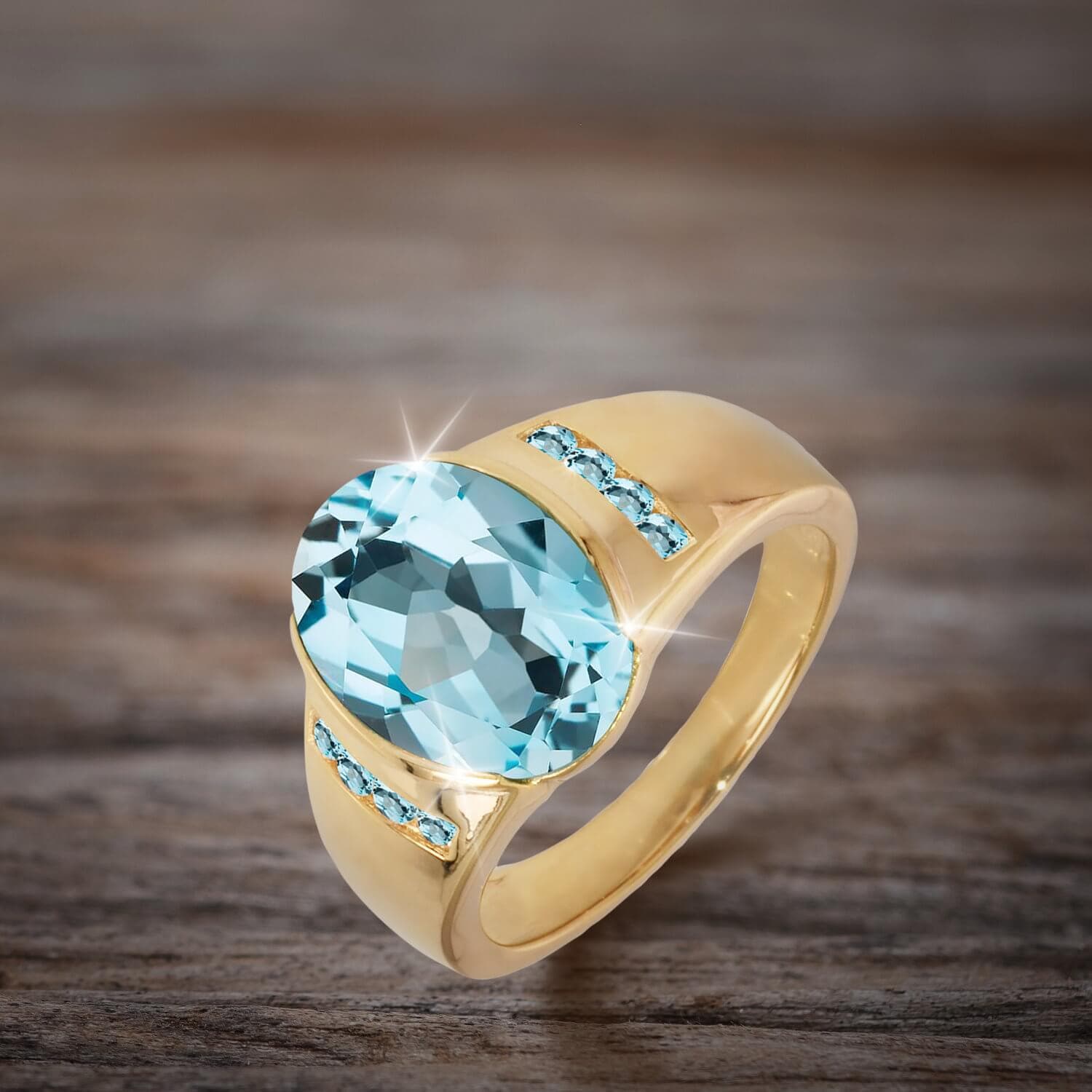The name topaz comes from Sanskrit meaning 'fire'. This sky blue gemstone has been expertly set in the center of this ring and flanked either side on the shoulders by even more topaz, totaling nearly 7.5carats. Crafted from sterling silver lavishly plated in yellow gold add the final touches to this luxurious item.