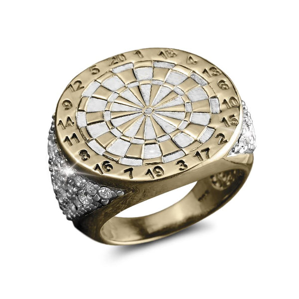 A delightful sports ring for all enthusiasts, a dart board that is represented in a generous 21mm diameter on this top surface. Crafted in sterling silver and precision set with a total of 58 Diamondeau® - flawless simulated diamonds on the shoulders. With your best flights and steel tips, wearing this will make a real statement.