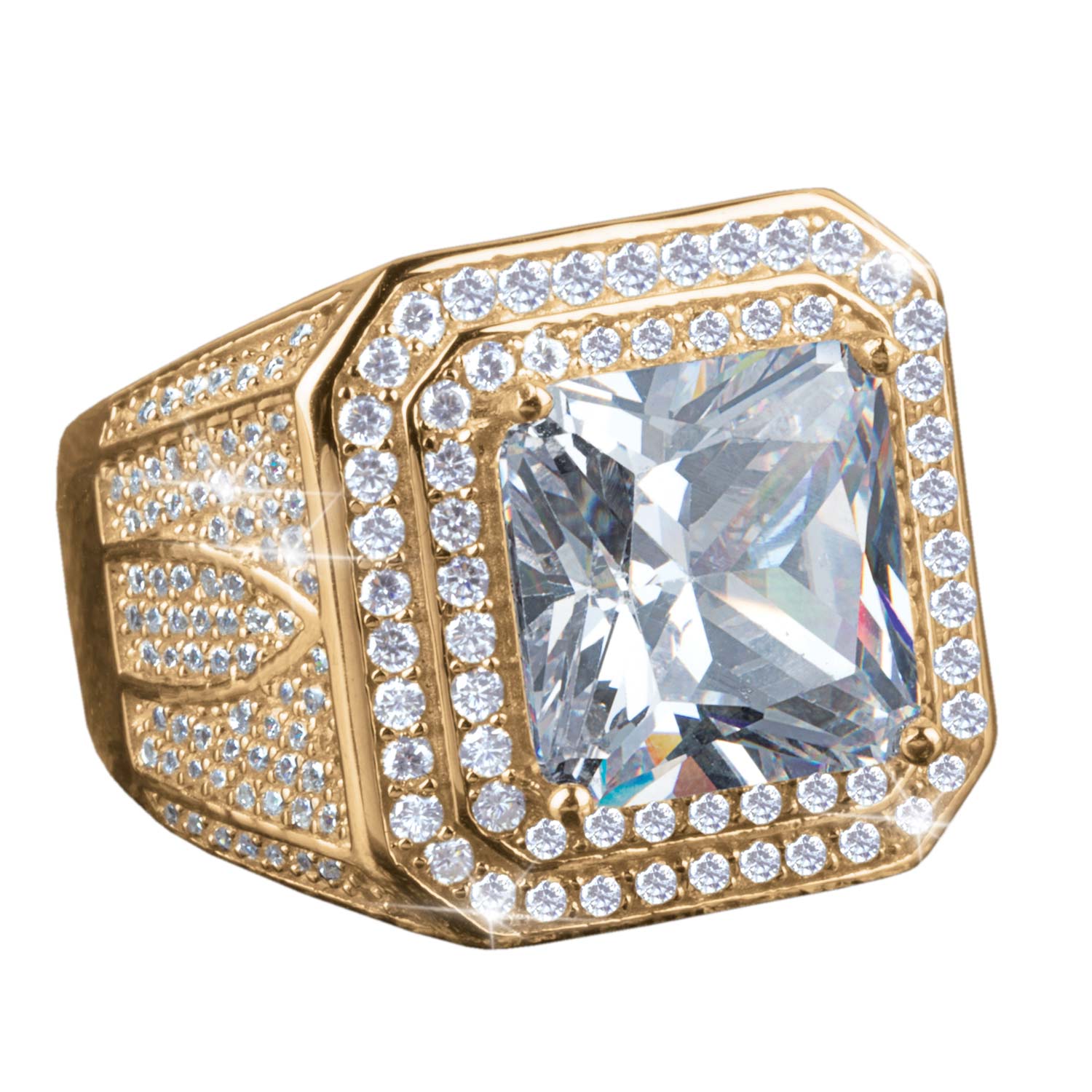 How many reasons can he find to wear this striking ring? Crafted in sterling silver, lavishly plated in 18k yellow gold. This ring features an impressive 10 ½ carats of Diamondeau®, flawless simulated diamond. Everyone will think you have won the lotto to be able to afford such a remarkable statement piece. We won’t tell if you don’t!