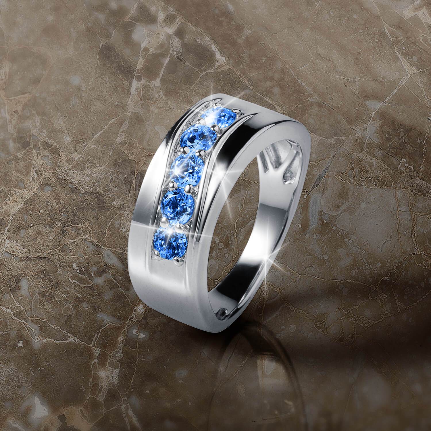 Expertly crafted from sterling silver, finished in rhodium, this dramatic design features five sparkling midnight blue Diamondeau®, flawless simulated sapphire, set across the center of a sculptured channel setting. A sophisticated look with 1.25ct of shimmering blue gems to complete his handsome style.
