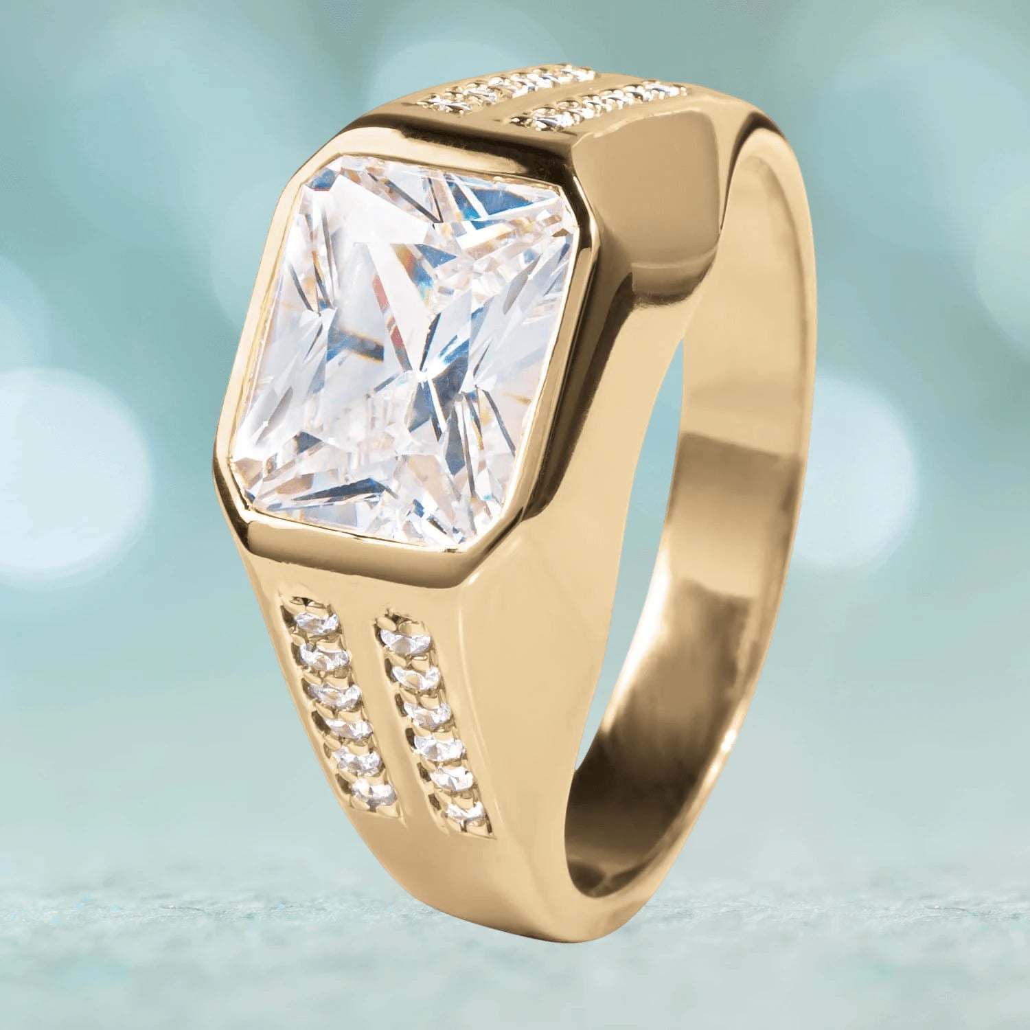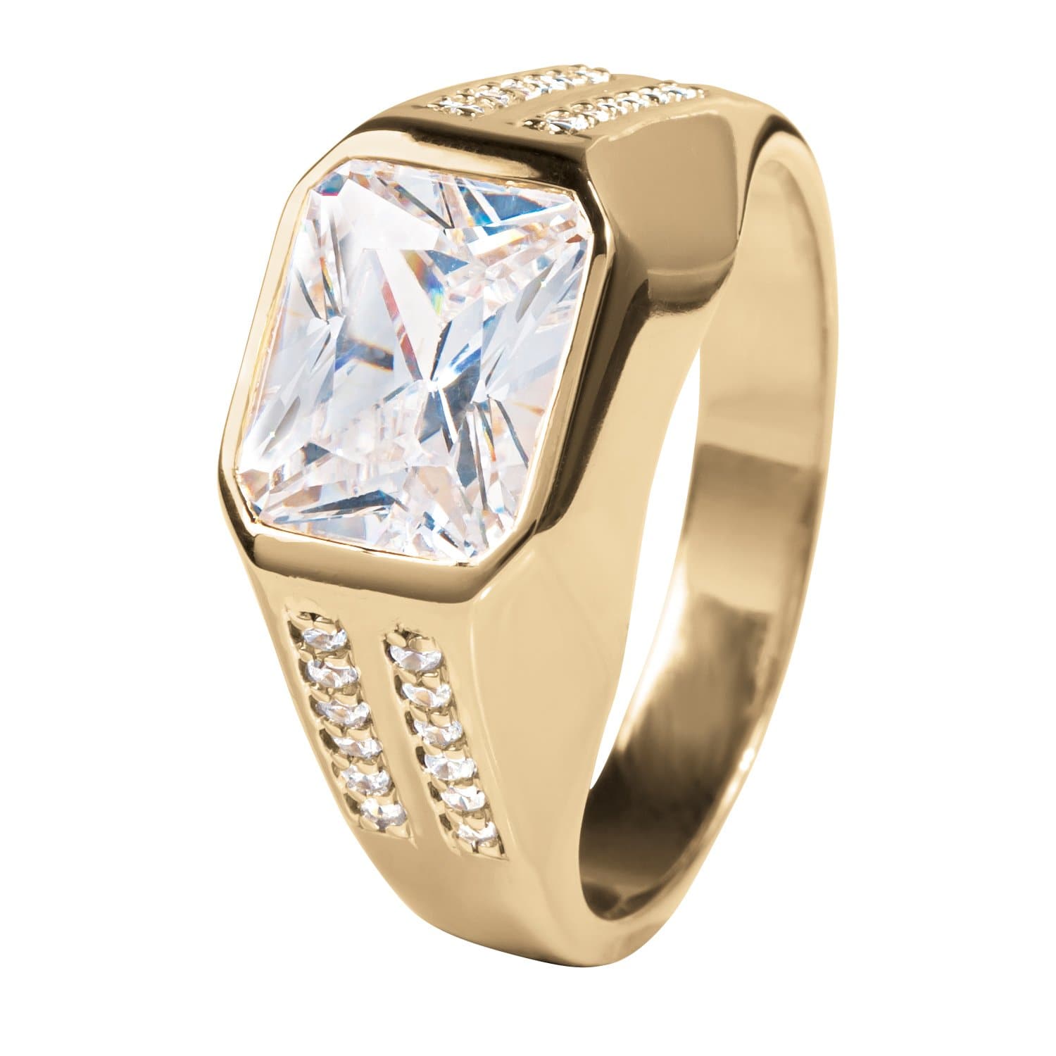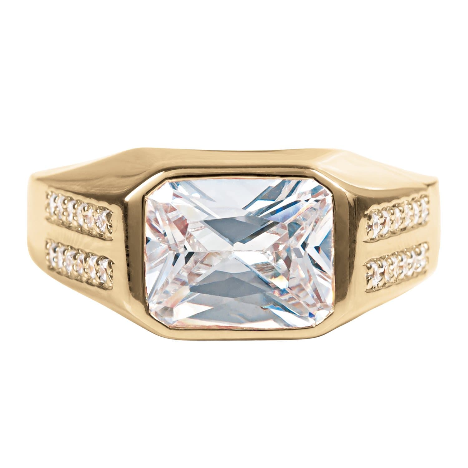 This ring has a striking centre of 3.49ct Diamondeau® - flawless simulated diamond. The glistening stone captures the light to create a dazzling effect with plenty of sparkle. On the shoulders is a cascade of a total of 24 accent Diamondeau® - flawless simulated diamond. Available in sterling silver plated in 18k yellow gold for timeless appeal. Making it a great gift idea for any style conscious man.