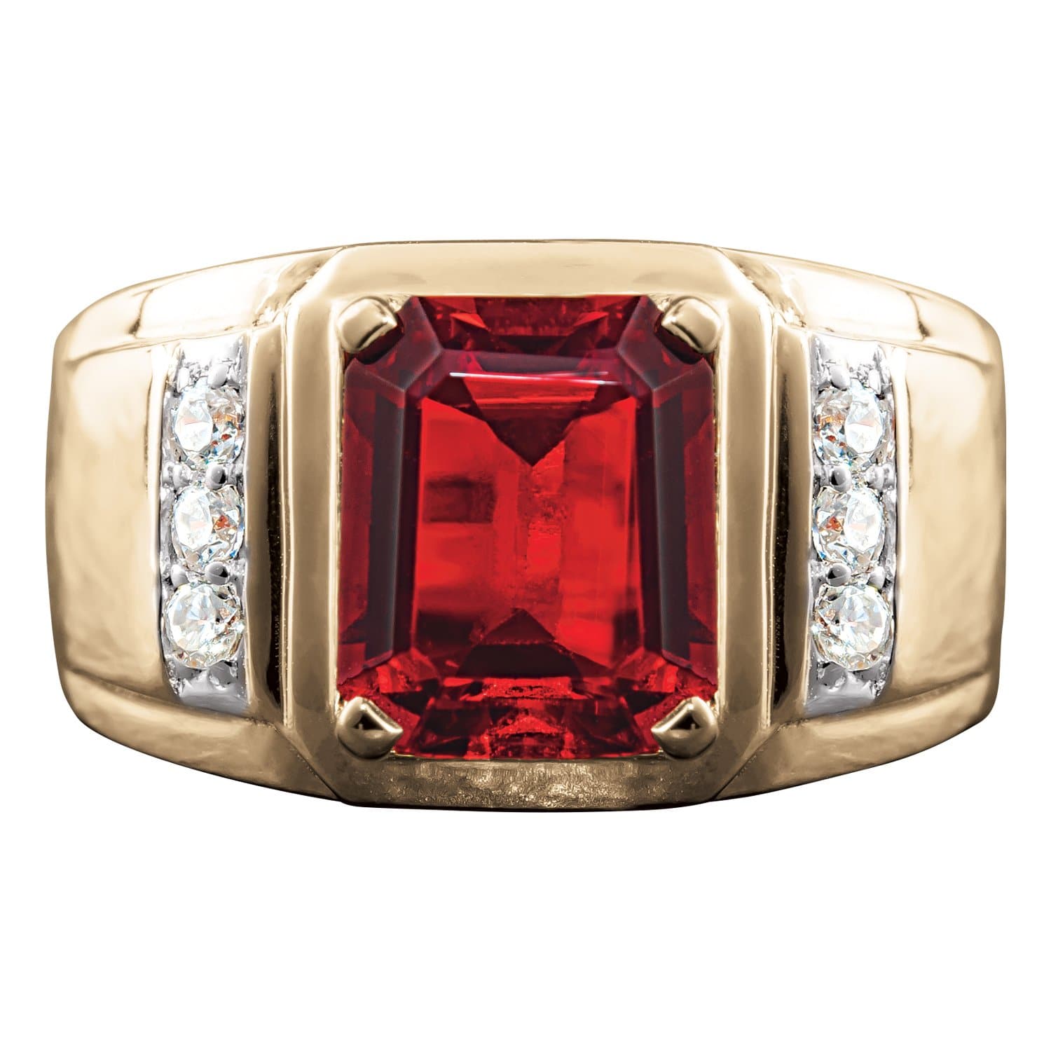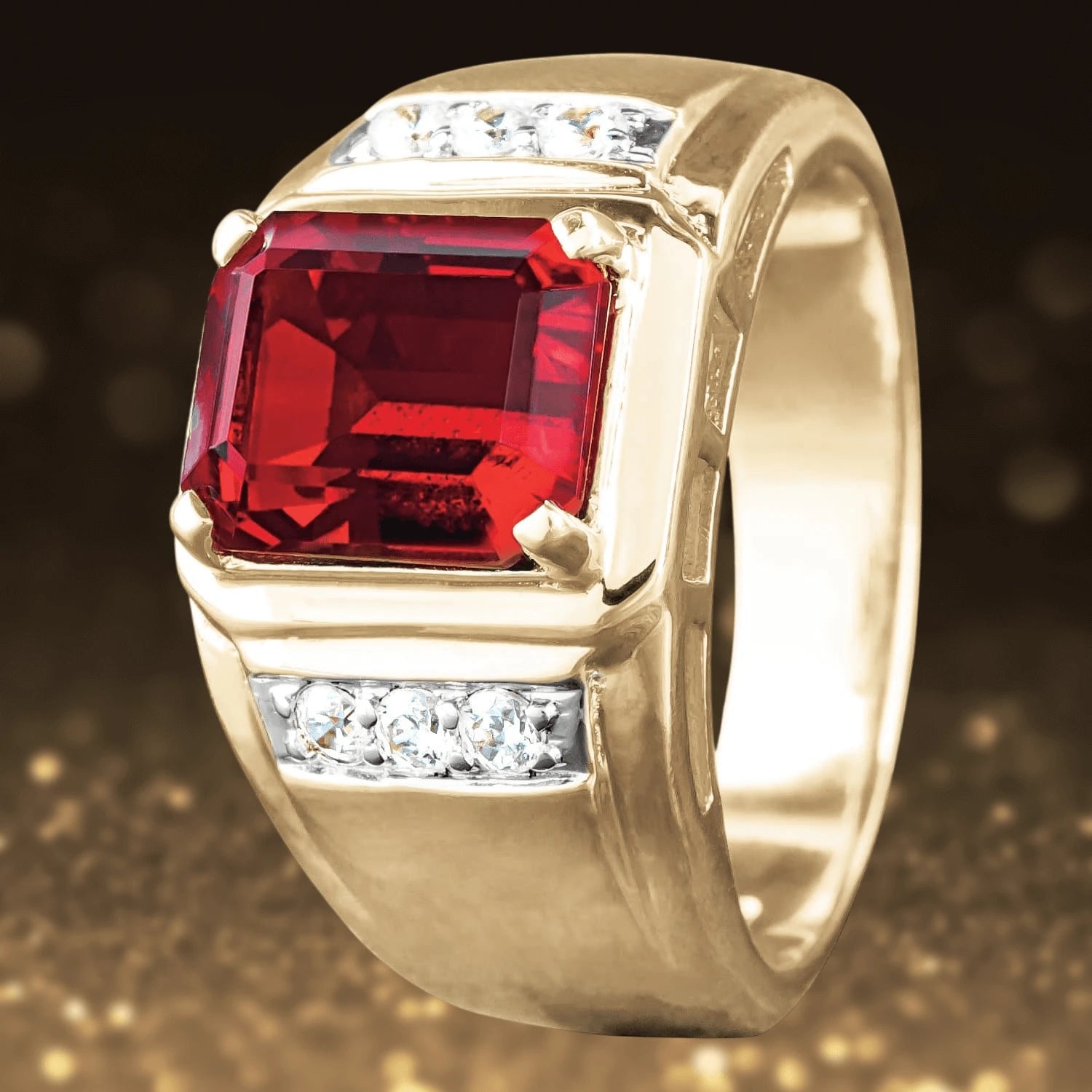 A glorious 3.49ct of red Diamondeau® - flawless simulated diamond; which personifies power and a timeless energy. Historically worn only by powerful men who were strong and respected as a sign of their authority. We bring you this sterling silver mount, lavishly plated in 18k yellow gold for a bold statement. With a regal finishing touch of 0.60ct accent Diamondeau® - flawless simulated diamond flanking either side. A perfect gift.