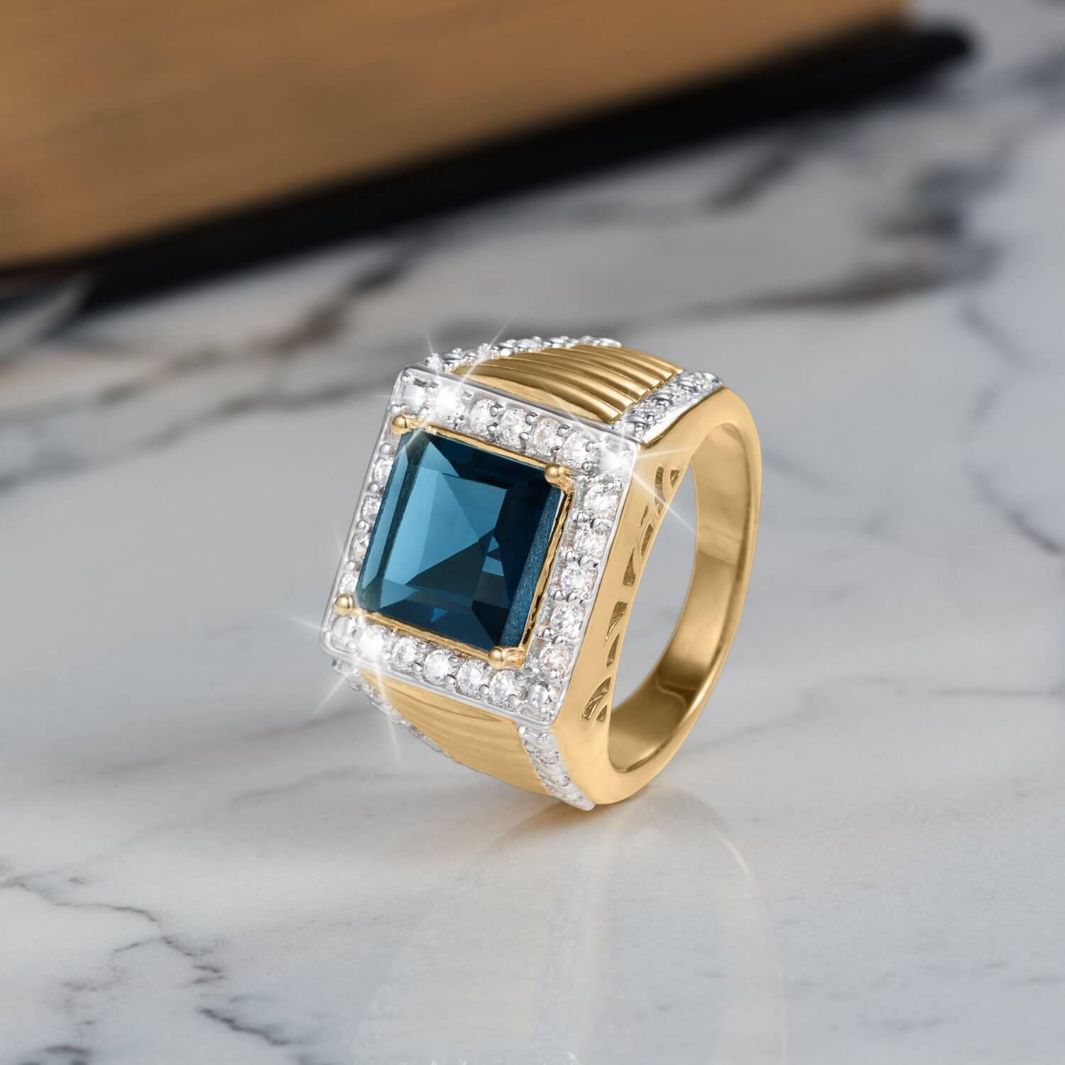Our impressive ring is expertly crafted by our master craftsmen from the finest sterling silver. An outstanding, over 5.5 carat petrol blue princess cut Diamondeau® - flawless simulated diamond has been set into the center. Surrounded by twinkling white Diamondeau® - flawless simulated diamond gems and luxuriously plated in yellow gold. The shoulders have been given added detailing with a stepped effect to give a classic look that he will be proud to wear.