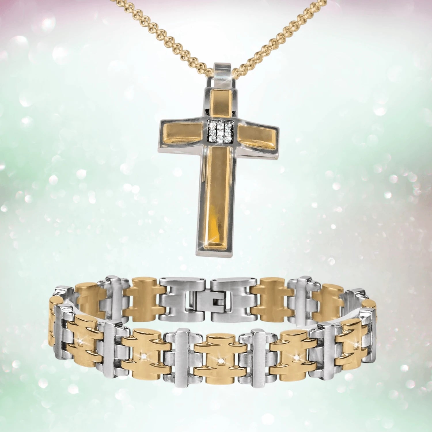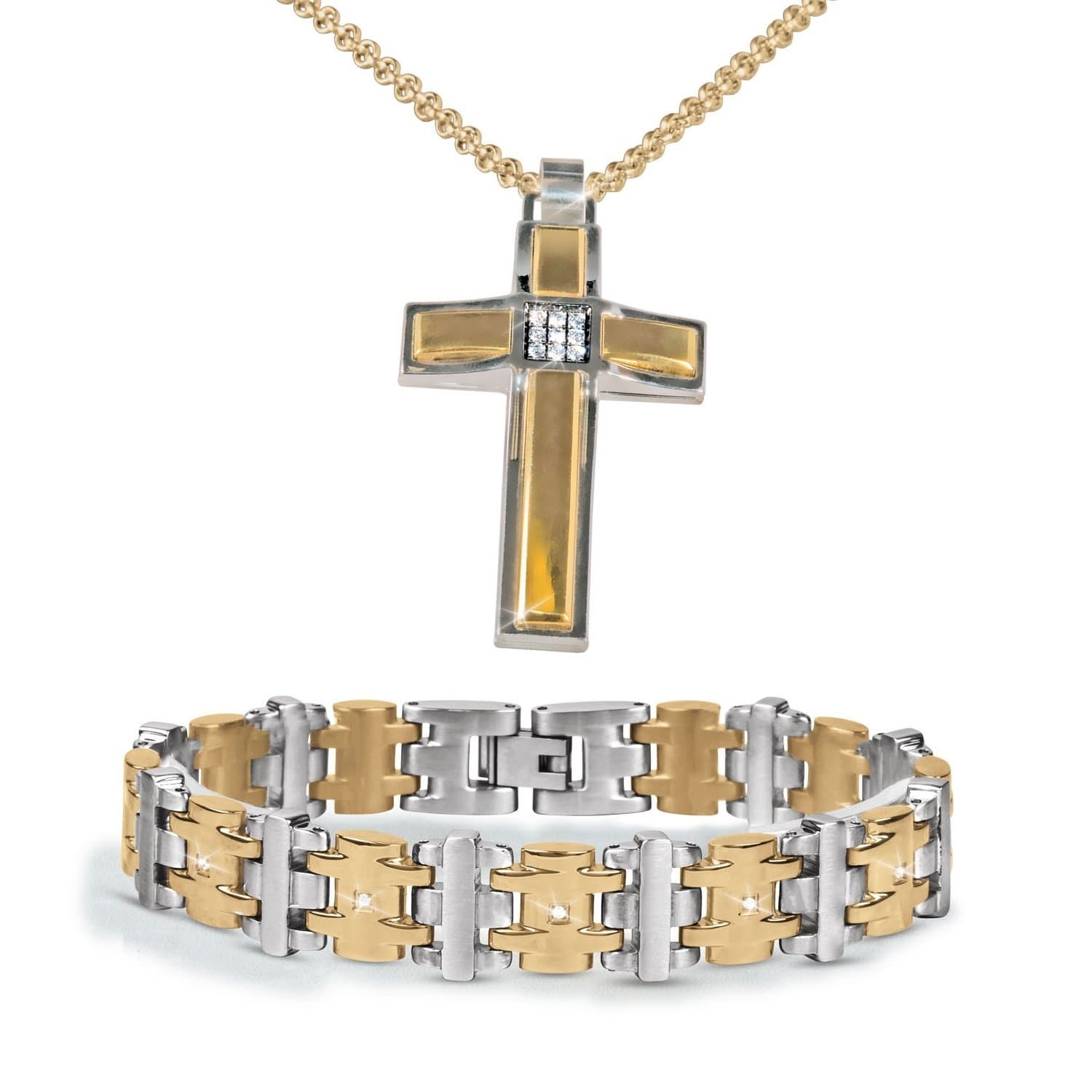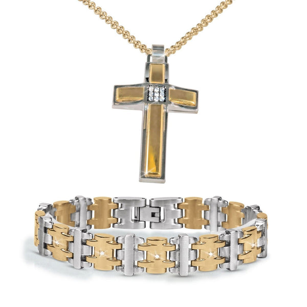 What a masterpiece of texture, sparkle and style. Fashioned from premium stainless steel, this designer piece features alternating polished 18k gold plated links with bright stainless steel. Set in the yellow gold links, sure to catch the eye, is a singular precision placed signature Diamondeau® - flawless simulated diamond. A cross pendant will complete his look; a two-tone finish, with 9 glistening Diamondeau® - flawless simulated diamond.