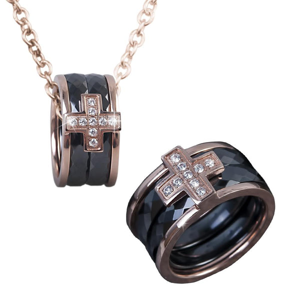 The perfect set to compliment many of our, , designer timepieces. Featuring faceted bands of, , Hi-tech ceramic enveloped in settings of solid, , stainless steel fused with rich red gold. A cross set, , with our flawless Diamondeau® - flawless simulated diamond is then, , attached to each piece for a luxurious finishing, , touch. Pendant includes matching chain.