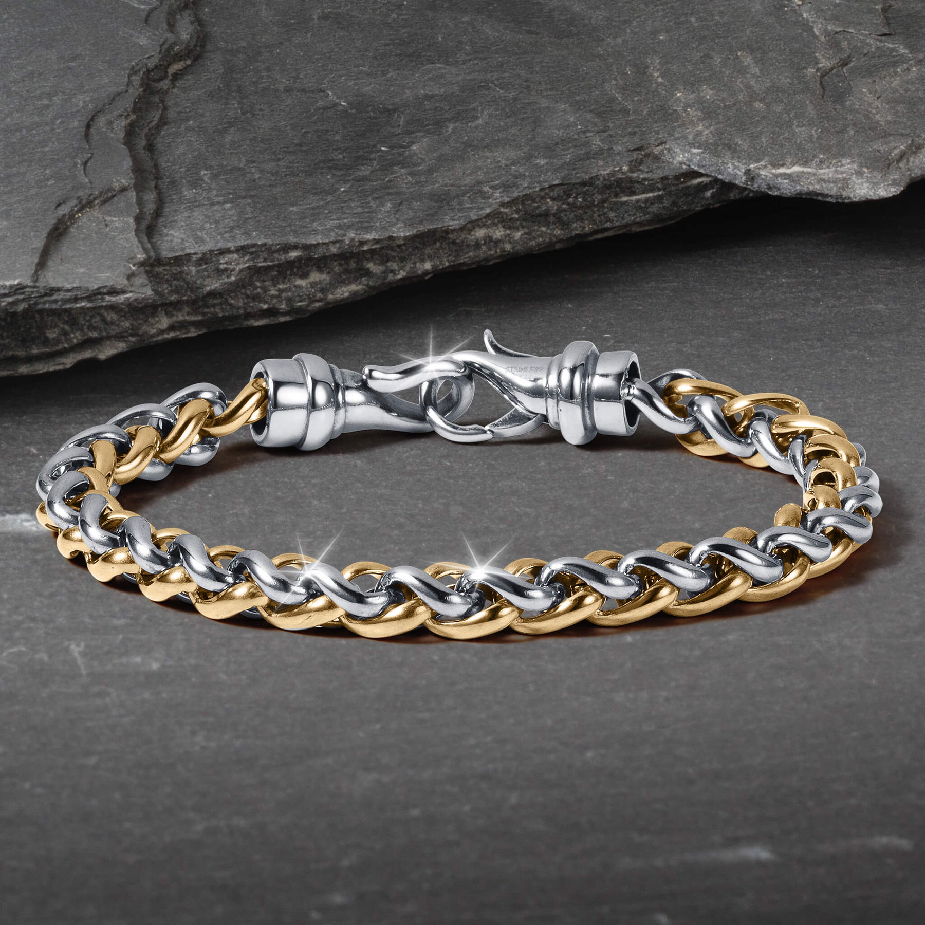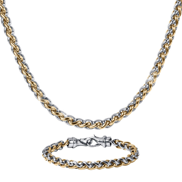 A distinguished men’s Spiga set designed to elevate your style. Crafted with precision from premium grade stainless steel with a striking two tone finish. The combination of sleek steel and warm gold tones creates a captivating contrast that catches the eye and sets you apart from the crowd. This exquisite set includes the same intricate chain design in a necklace and bracelet designed to elevate your style and make a bold statement.