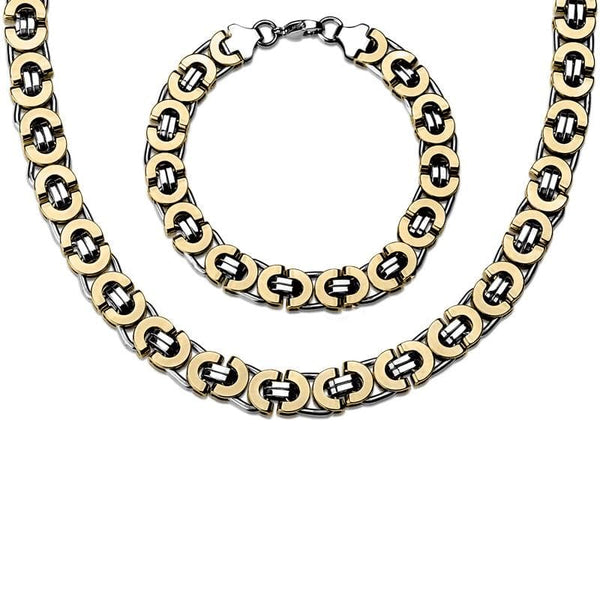 The byzantine chain is an intricate, closely linked sequential chain design which has ancient origins dating back to the 5th Century.The links are used in pairs, with a vertical pair joined by a horizontal pair to a vertical pair. The result is a chain with a very detailed rope like appearance and texture. Here we bring you a flat version of the byzantine chain, and also finished on alternate links with yellow gold for a two tone effect. A really special chain for the gentleman looking for something a little bit different.