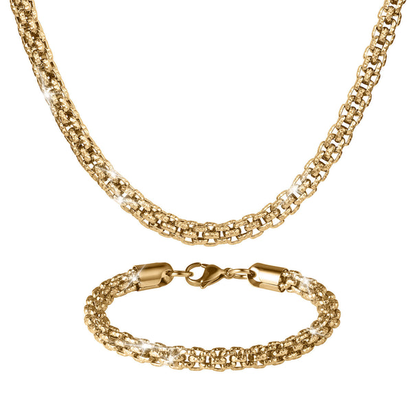 Using the finest materials to the highest standards we bring you this stylish set, perfect for the refined gent. Expertly engineered from premium stainless steel with a golden finish. This enigmatic Italian inspired Bismark link has an intricate diamond cut detail which adds texture and a shimmering mesh motif. Designed With every day in mind and sure not to disappoint.
