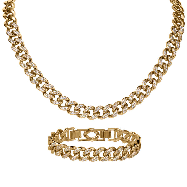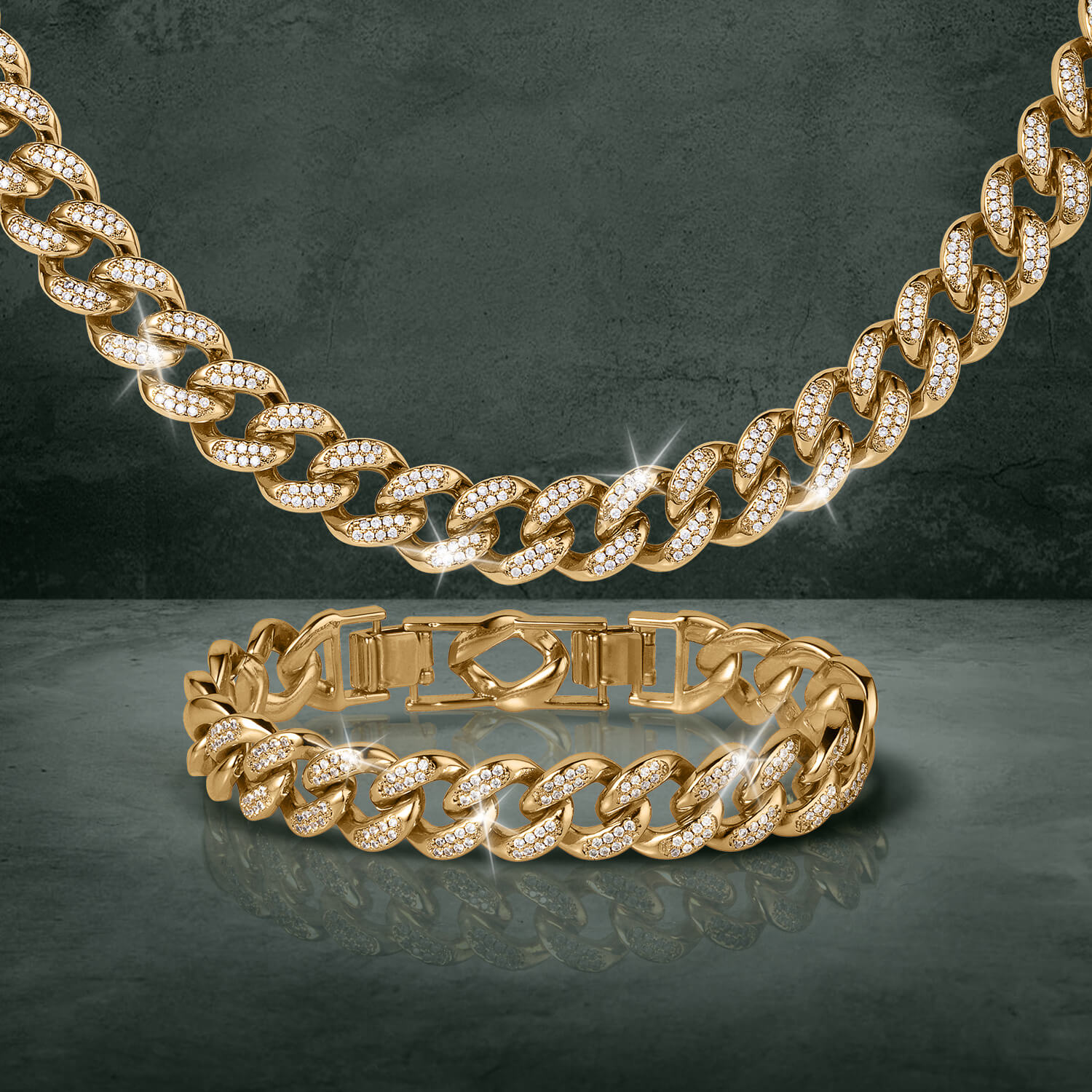 Add elegance to your style with this stunning jewelry collection. The premium grade stainless steel curb chain is finished in rich yellow gold. The center links have been handset with shimmering Diamondeau®, flawless simulated diamond. A masculine, classic collection with a modern twist.