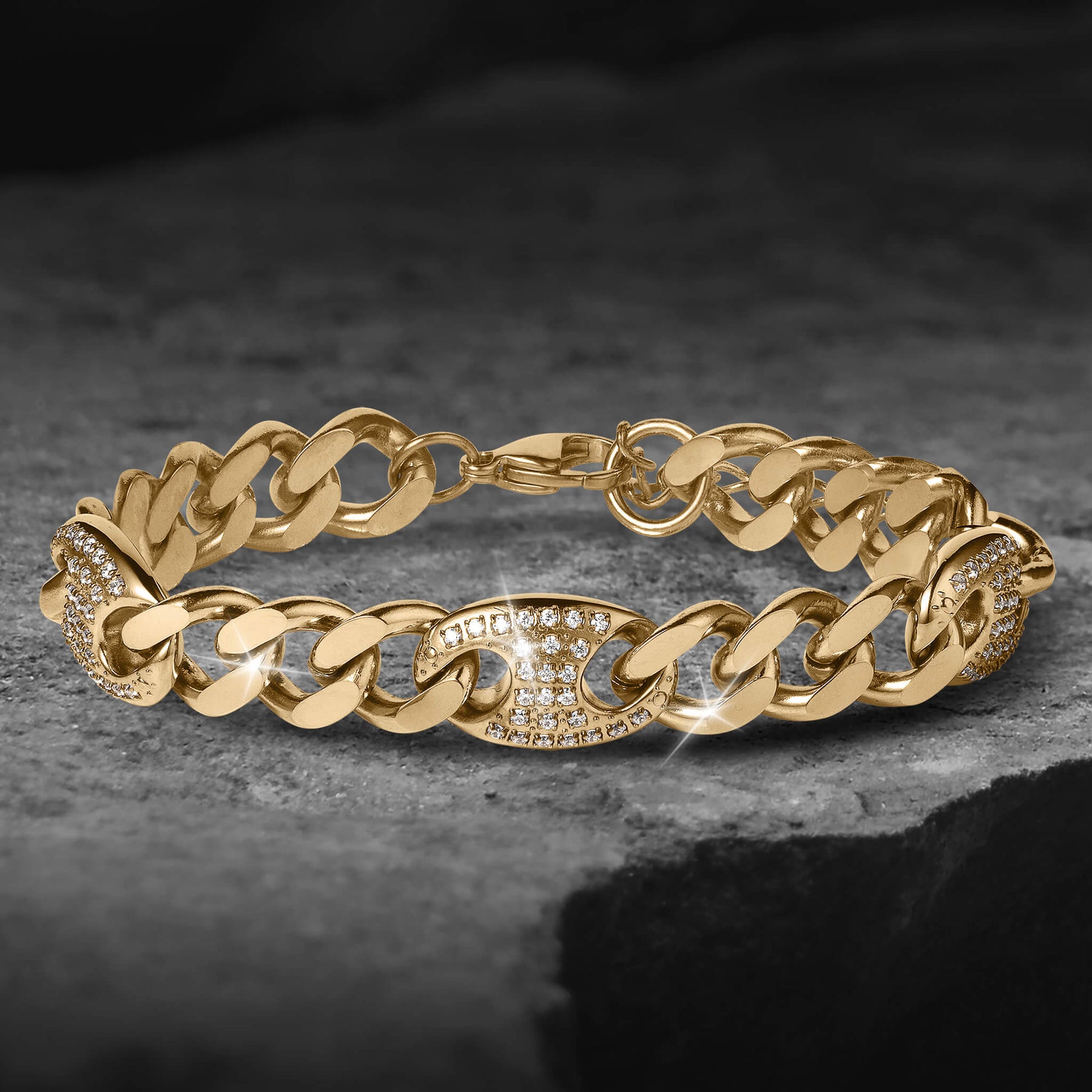 This collection is a classic that will never go out of style. Finely crafted from premium grade stainless steel with a luxurious gold finish. This bracelet and necklace feature timeless curb links. What sets this apart are the oval stations encrusted with sparkling ice white Diamondeau®, flawless simulated diamond. The result is a stunning jewelry set that is both bold and sophisticated.