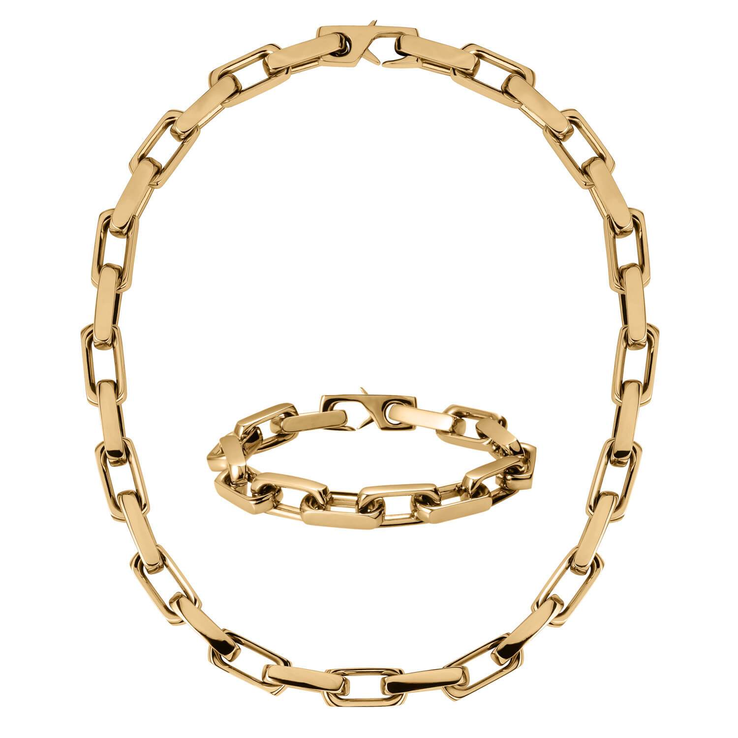 This innovative men's necklace and bracelet collection combines the strength of yellow gold fused solid stainless steel. These bold 3D links of our Insignia set are engineered from premium grade 316L solid stainless steel, the best you can get in a classic belcher style chain. The first choice for a real statement piece.