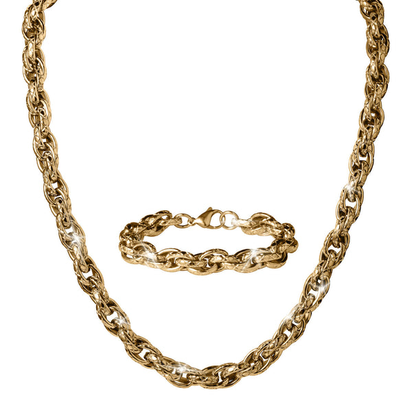 This men’s collection is sure to impress. The Prince of Wales chain consists of circular links joined together to create a 3D effect, our design has unique textured pattern added to the links for that eye catching appeal. This chunky design is expertly crafted from premium grade stainless steel and has been finished in luxurious yellow gold. This is the perfect accent collection for any outfit