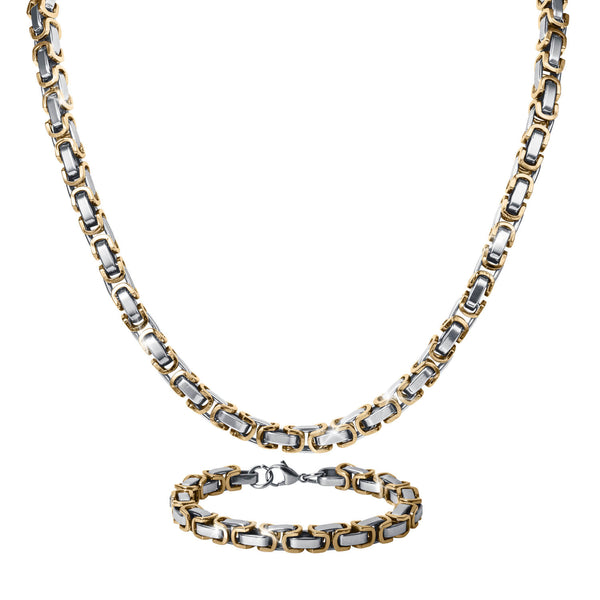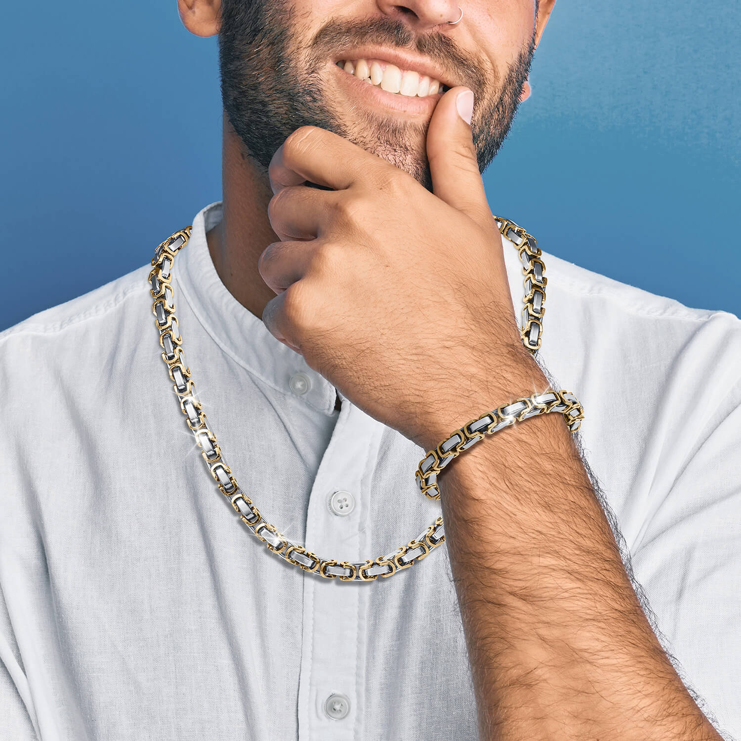 This Byzantine style chunky chain and bracelet set is an impressive piece that will suit every man's taste. Crafted from premium grade stainless steel with a two tone finish. These chains stand out on their own or as a set, whether you wear them to the office or when socializing, they are sure to draw attention.