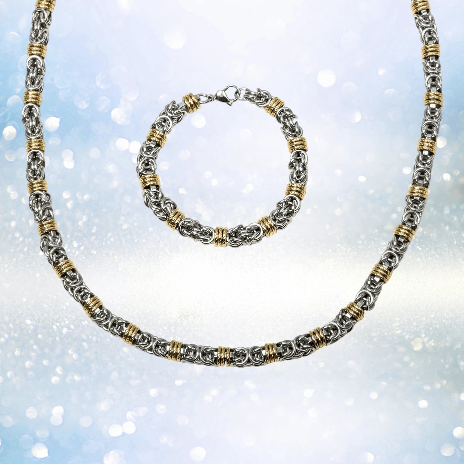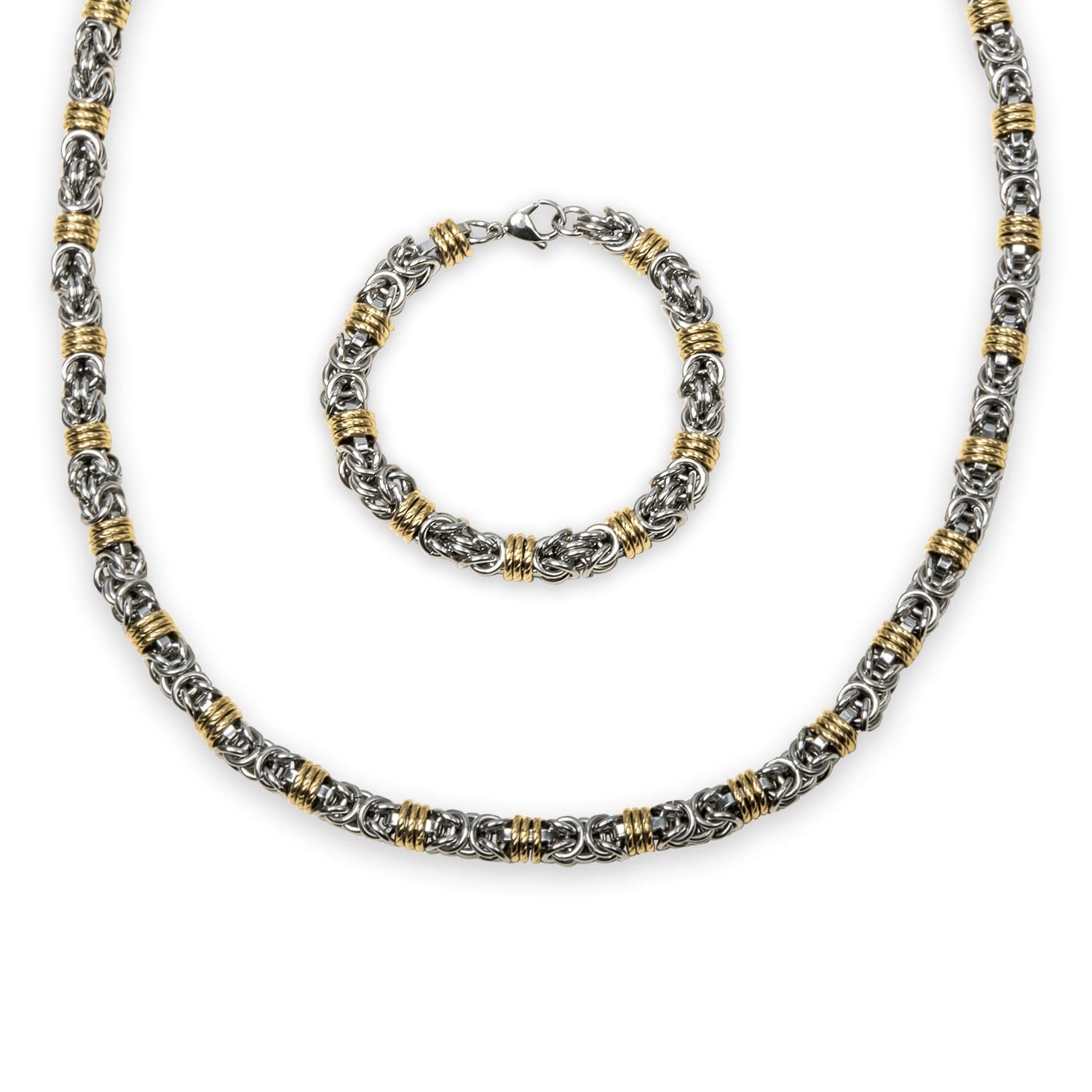 Our sensational men's multi-link necklace and bracelet set is a popular choice of men's jewelry to give to the man in your life. The two toned look of our premium stainless steel chain, with added 18k gold features, brings added interest to the set. You can pair either piece with other stainless steel jewelry you may already own, or wear the items alone for a chic look. Perfect as a gift or treat for yourself.
