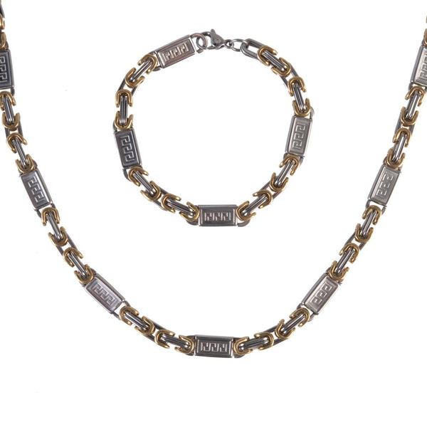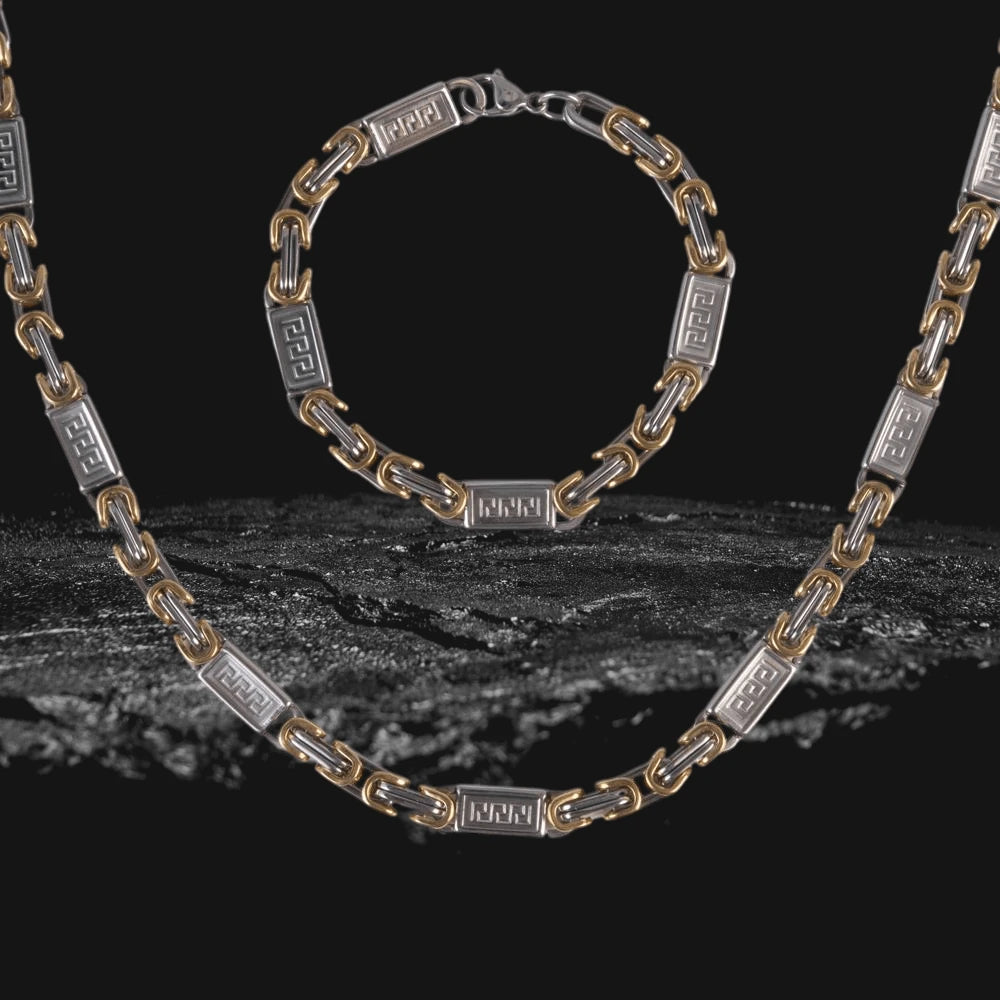 The meander pattern, Greek key pattern, or even Greek Lines as it is usually known in Italy, features in many traditional Greek art forms. Whatever name you wish to call it, it is a classic must-have—an absolute all-year-round winner—and we couldn't be happier to bring you a definitive set made of the best premium-grade 316L solid stainless steel. Featuring this unpretentious pattern in its links and an 18k yellow gold plating in its connecting sections.