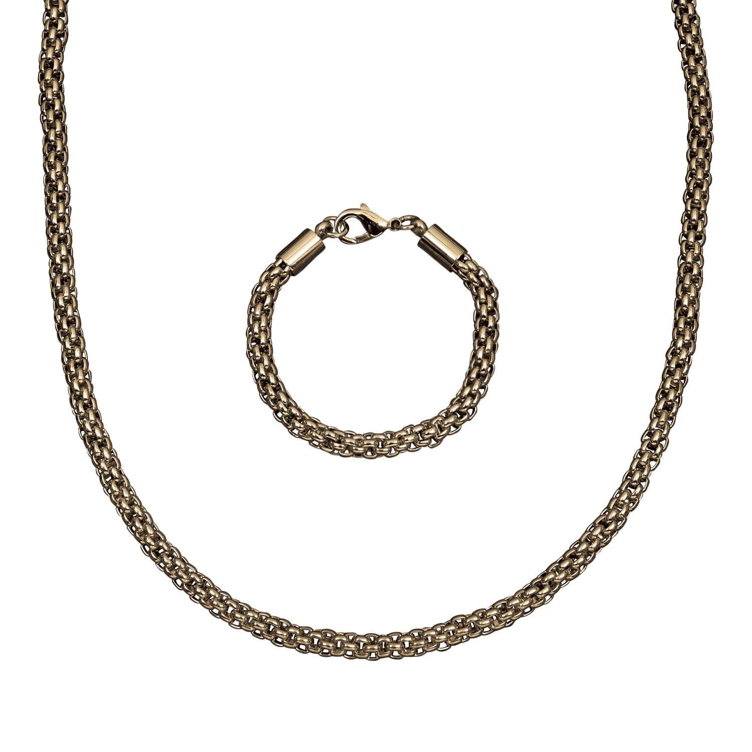 Give him a handsome and masculine look. Fashioned in premium stainless steel and generously plated in warm 18k yellow gold. The intricate links are interwoven making this solid effect necklace and matching bracelet. Guaranteed to be a jewelry staple for everyday wear.