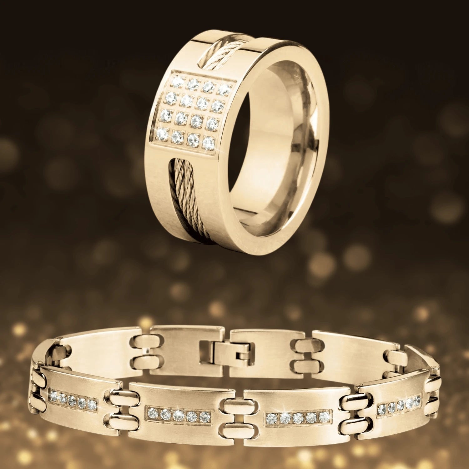 This bold style with a hint of sparkle is just his style. Crafted from premium stainless steel lavishly plated with 18k yellow gold, the bracelet features 1.20ct glistening Diamondeau® - flawless simulated diamond. A smart look for the boardroom or the gym. A ring in complimenting style completes the look; inlayed with cable inserts and 16 stunning Diamondeau® - flawless simulated diamond. A great anytime look.