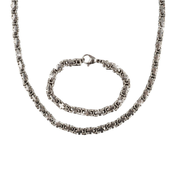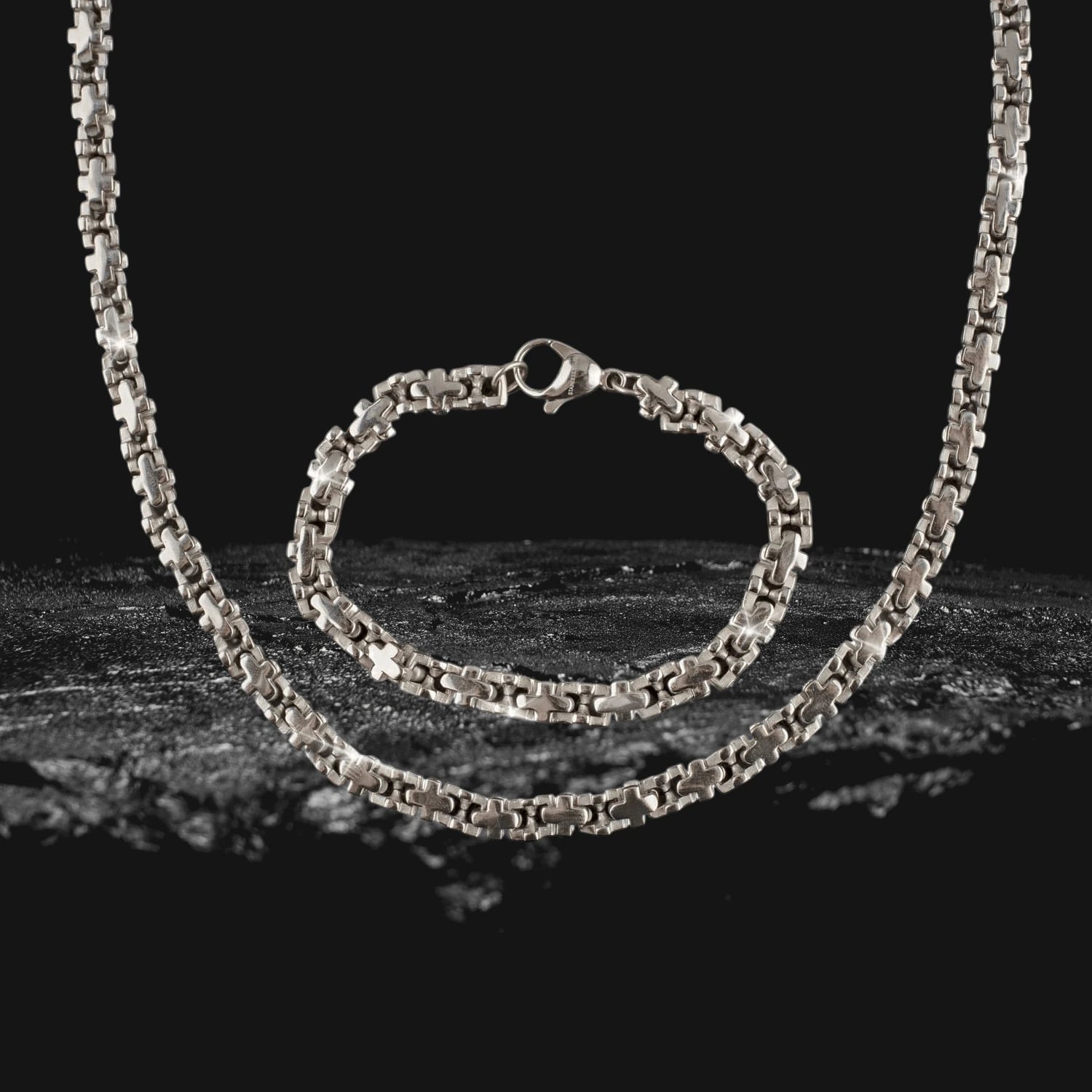 This sophisticated men's collection is ingeniously made up of interlocked links that will curve around your wrist and neck. The premium grade solid stainless steel links have been given a fashionable look with the chunky designer styling. Available in either necklace or bracelet and steel or gold finish buy together for a great saving.