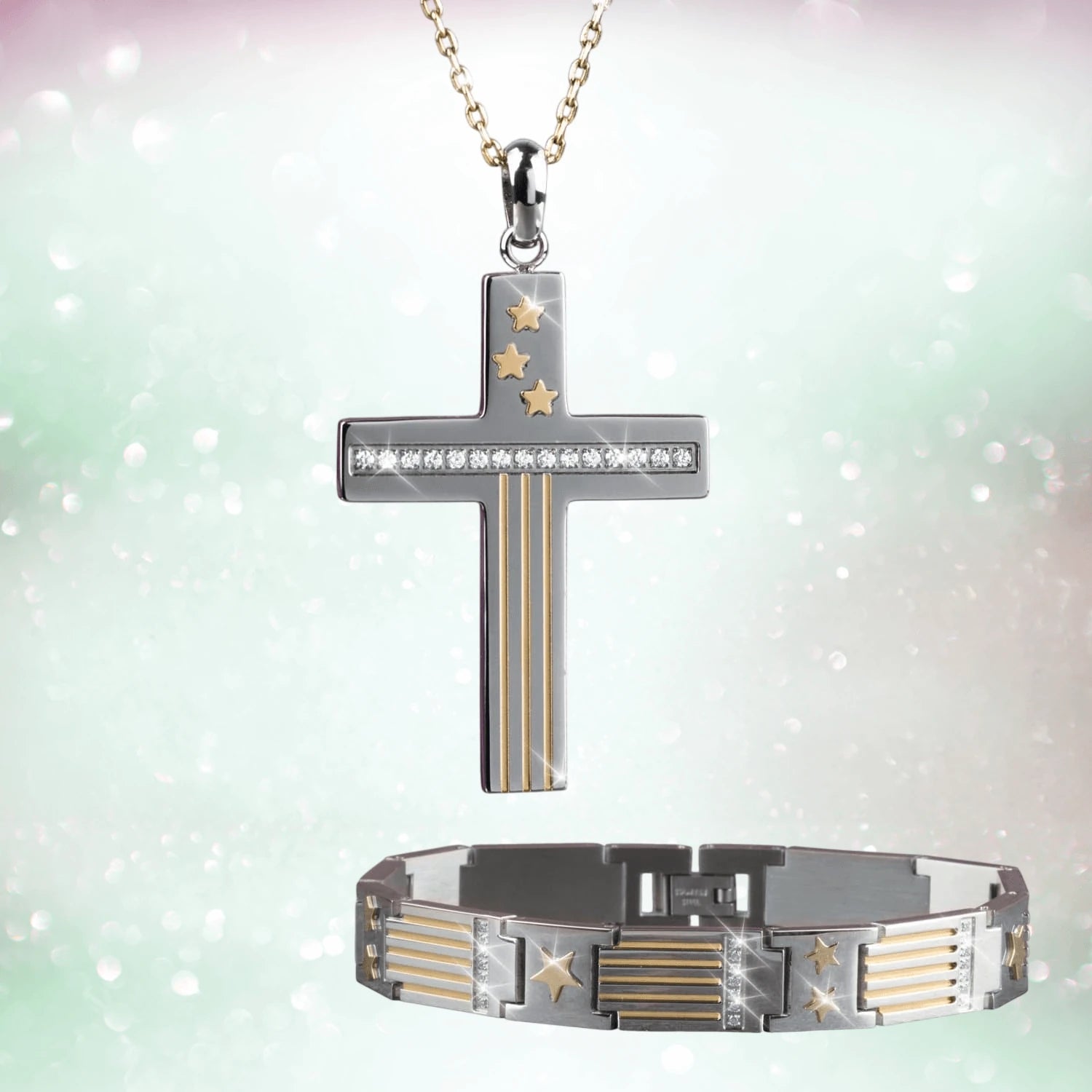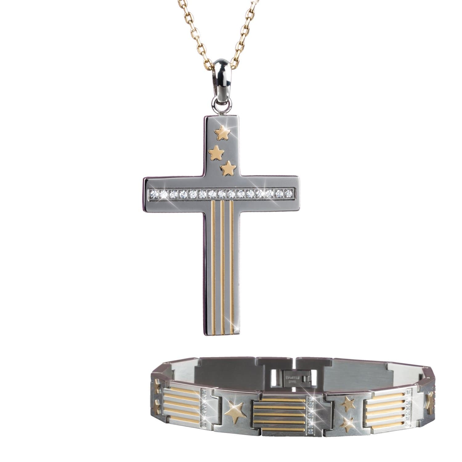 Celebrated in this collection are the stars and stripes synonymous with the U.S. flag. Crafted in premium stainless steel, in two tone finish this collection of bracelet and pendant is subtle patriotism. On June 14, 1777 the Continental Congress passed the first Flag Act, which said that the flag would be made up of thirteen alternating red and white stripes and thirteen white stars on a blue field. Stars have been added to the flag as new states join the union. Stars are considered a symbol of the heavens and the divine goal to which man has aspired from, with the stripe symbolic of the rays of light emanating from the sun. Using the finest materials finished to the highest standards, Timepieces International has developed a vast range of watches and accessories that provide a purposeful, visual statement. These beautiful products are available at astonishingly low prices, often costing less than a quarter of the recommended price., , , , You may ask how we can offer such quality at such low prices? The answer is beautifully simple: we cut out the middleman. This means there are no retail overheads to pay and not the usual mark up to make which can be enormous on luxury watches and jewelry.