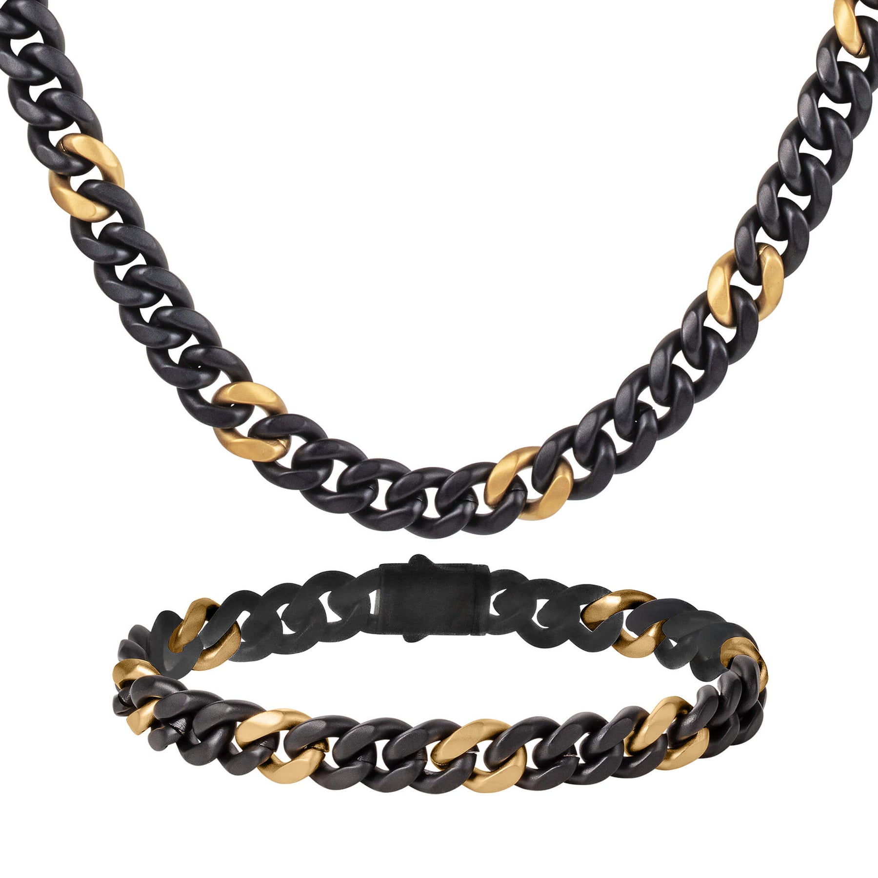 Elevate your style with this classic Cuban chain and bracelet set, meticulously crafted from premium grade stainless steel. This set combines durability with timeless elegance. The two tone matt black and gold finish offers a bold yet sophisticated look, perfect for both casual and formal occasions. Whether you’re making a statement or adding a finishing touch to your outfit, this set delivers unmatched style and versatility.
